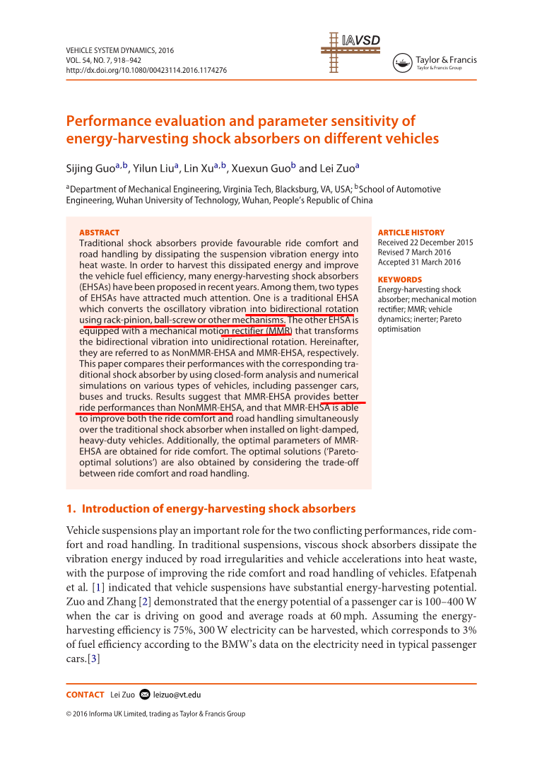 车辆悬架对两个冲突的性能、平顺性和操作稳定性起着重要作用。在传统悬架中, 粘性减振器将道路不平顺和车辆加速度引起的振动能量消散, 从而提高了平顺性操作稳定性。Efatpenah 等 [1] 表示, 汽车悬架有足够的馈能潜力。左和张 [2] 证明了客车的能量潜力是 100-400 W 当汽车驾驶在好和平均路在60每小时. 假设馈能效率是 75%, 300 W 电能被收获, 相当于3% 燃料效率根据宝马关于典型客车用电需求的数据。[3]