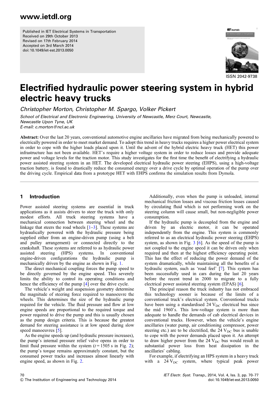 在过去的20年里,传统的汽车发动机辅助动力从机械动力转向电力驱动,以满足市场需求。为了适应这种趋势,重型卡车需要一个更高的电力系统,以应付更高的负荷。直到混合动力重型卡车(HET)的出现,这种电力基础设施还没有出现。HET需要一个更高的电压系统,以减少损耗,并为牵引电机提供足够的功率和电压水平。本研究首次探讨了液压助力转向系统在HET中的应用。采用高压牵引电池,开发出的电动液压动力转向系统(EHPS)在驱动循环中,通过泵的最优运行来降低驱动周期的能量消耗。用EHPS的原型HET的经验数据证实了来自Dymola的模拟结果。