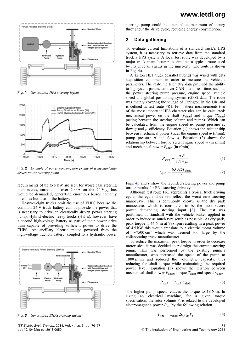 一辆12吨的HET卡车(并联混合动力)与数据采集设备连接在一起,以测量车辆的参数。实时遥测数据能够实时记录系统参数,如动力转向泵压力、发动机转速、车辆速度和全球定位系统(GPS)数据。该路线主要覆盖了英国的法灵顿村,并被定义为测试路径FR1。从这些测量中可以计算出两个最重要的HPS特性:轴(P)的机械功率和转向柱与泵之间的扭矩(T)。可以通过发动机转速v、泵压p、流量g和u效率计算。式(1)显示机械功率P、发动机转速v(r/min)、泵压P、流量q之间的关系。式(2)显示转矩T、发动机转速v(r/min)与机械功率P(r/min)之间的关系。