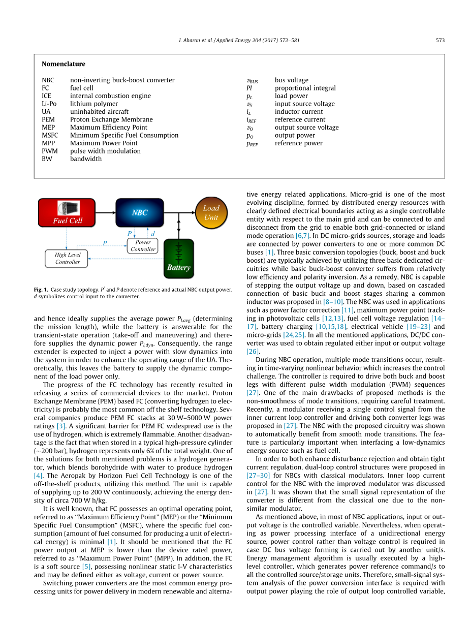 元(FC)和功率单元(电池),从而创建了如图1所示的直流微电网。其中,FC负责稳态运行(巡航)并因此理想地提供平均功率(确定任务长度),同时电池负责瞬态操作(起飞和操纵),并因此提供动态功率。因此,增程器预计会向系统中注入动力缓慢的动力,以提高UA的运行范围。理论上,这使得电池只能提供负载功率的动态分量.FC技术的进步导致市场上推出一系列商用设备。基于质子交换膜(PEM)的FC(将氢转化为电)可能是最常见的现成技术。几家公司生产功率为30W-5000W的PEMFC堆栈[3]。 PEMFC广泛使用的一个重要障碍是氢的使用,这是非常易燃的。另一个缺点是,当存储在典型的高压缸(〜200巴)中时,氢气仅占总重量的6%。上述两个问题的解决方案之一是氢气发生器,它将硼氢化物与水混合生成氢气[4]。燃料电池技术Aeropak是现成的产品之一,利用这种方法。该装置能够连续供电200W,达到约700Wh / kg的能量密度。众所周知,FC具有称为“最大效率点”(MEP)或“最小特定燃料消耗量”(MSFC)的最佳操作点,其中特定燃料消耗量(生产所消耗的燃料量一个电能单位)是最小的[1]。应该提到的是,MEP处的FC功率输出低于设备的额定功率,称为“最大功率点”(MPP)。此外,FC是一个软源[5],具有非线性静态I-V特性,可以定义为电压,电流或电源。开关电源转换器是现代可再生能源和替代能源相关应用中用于电力传输的最常见能源处理单元。微电网是最具发展潜力的学科之一,由分布式能源形成,具有明确定义的电气边界,作为与主电网相关的单个可控实体,可连接至电网并与电网断开连接,以实现并网或孤岛模式操作[6,7]。在直流微电网电源中,存储和负载通过电源转换器连接到一个或多个公共直流母线[1]。三种基本的转换拓扑结构(降压,升压和降压-升压)通常通过利用三个基本专用电路来实现,而基本降压 - 升压转换器受到较低效率和极性反转的影响。作为一种补救措施,NBC可以根据基本降压和升压级的级联连接来提高和降低输出电压,这是在[8-10]中提出的。 NBC被用于诸如功率因数校正[11],光伏电池[12,13]中的最大功率点跟踪,燃料电池电压调节[14-17],电池充电[10,15,18],电动车辆[19-23]和微电网[24,25]。在所有提到的应用中,使用DC / DC转换器来获得调节的输入或输出电压[26]。在NBC操作期间,发生多个模式转换,导致随时间变化的非线性行为,这增加了控制的挑战。控制器需要用不同的脉宽调制(PWM)序列驱动降压和升压支路[27]。所提出的方法的主要缺点之一是模式转换不平滑,需要谨慎处理。最近,[27]中提出了一个调制器从内部电流回路控制器接收单个控制信号并驱动两个转换器支路。显示NBC与推荐电路自动受益于平滑模式转换。当连接诸如燃料电池等低动力能源时,该功能尤为重要。为了增强干扰抑制和获得紧凑的电流调节,在[27-30]中提出了具有经典调制器的NBC的双环控制结构。文献[27]讨论了用改进的调制器对NBC进行内环电流控制。结果表明,由于非相似的调制器,转换器的小信号表示不同于经典的表示。同时考虑到与其输入和输出终端连接的单元的行为。 本文研究了采用改进的双载波调制器工作于典型直流微电网的NBC,通过级联控制结构进行分析和运行,以调节输出功率。 设计简单的双回路控制器,分析系统性能整个预期的操作范围。作为案例研究,所提出的电路作为FC的功率处理接口工作,作为电池供电飞行器的增程器使用。选择NBC拓扑是因为Li-Po电池端子电压随着充电时,燃料电池的输出电压根据工作功率而发生显着变化。系统稳定性和鲁棒性分析也被给出为了验证在不同的操作极端的正确操作。建立并测试实验原型以验证所提出的分析的可行性。