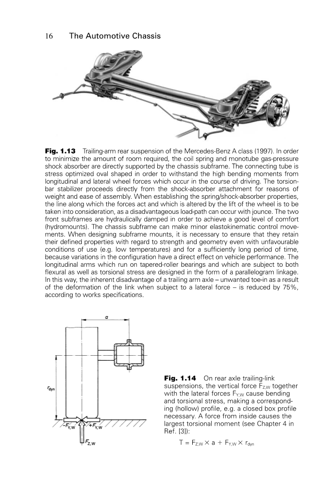 图1.13梅塞德斯-奔驰A级后悬架(1997)。为了最大限度地减少所需的空间,螺旋弹簧和充气减振器直接由底盘架支承。连接管为应力优化的椭圆形,以承受在驱动过程中产生的纵向和横向车轮传来的大弯矩。扭力杆稳定器直接从减振器附件中取出为了减轻重量、装配方便。在确定弹簧和减震器的性能时,要考虑力作用的方向以及车轮升力的改变,因为颠簸会产生不利的负载路径。两个支架是液压阻尼,以达到一个良好的水平的舒适性(液压安装)。底盘副车架支座可以进行较小的弹性控制运动。在设计支架安装时,有必要确保即使在不利的使用条件(如低温)和足够长的时间内,它们也能保持其强度和几何特性,因为结构的变化直接影响到车辆的性能。采用平行四边形的连杆机构,设计在圆锥滚子轴承上运行的受弯扭应力共同作用的纵向臂。这样,根据工程规范,拖曳臂悬架的固有缺点——当受到侧向力时,由于连杆变形而导致不必要的内倾现象——减少了75%。