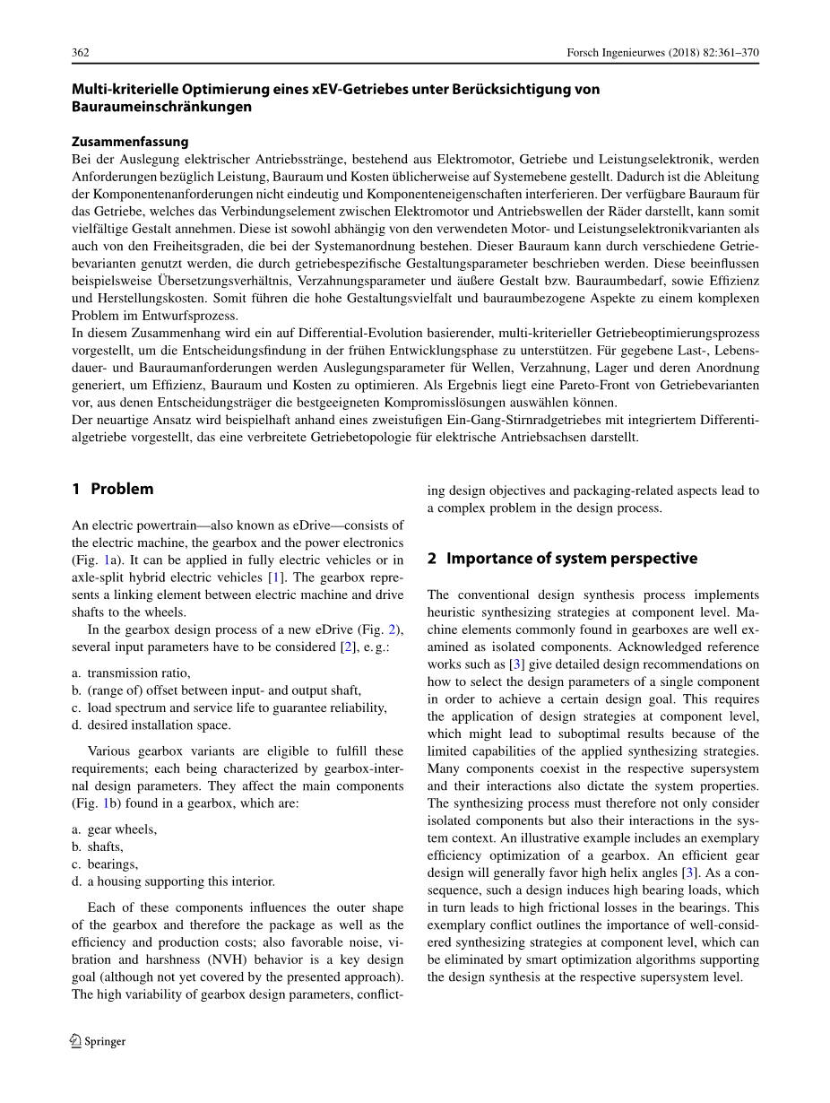 在已发表的着作中很少考虑的另一个方面是优化问题的整体方法,仅以[5,7]和[8]中的优化的示例性方式考虑齿轮传动参数,忽略来自轴承选择带来的影响。但是,整体设计方法必须将所有相关设计目标视为目标,而且所有作为优化参数的设计参数显着影响这些目标。在最近的研究中,Albers等人提出了一种用于电动动力系统的整体优化方法[10],这种方法专注于电、动力电子设备、电动机和动力传动系统,它概述了如何建立系统交互的一般方法,但是没有讨论具体的设计方法和优化策略。
