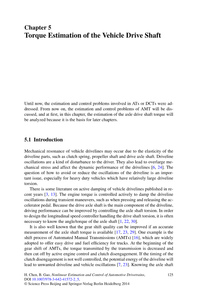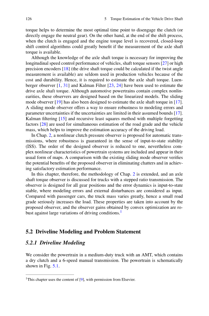 直到现在,自动变速器和双离合变速器中的估计和控制问题已经被提出。从现在起,手自一体变速器的估计和控制问题将会被讨论。首先,在这一章,我们将会分析驱动轴上扭矩估计的问题,因为它是后面章节的基础。