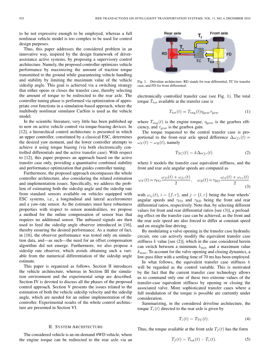 基于制动器的解决方案的替代方案是由在车辆传动系中使用的新一代扭矩偏置装置,它可以被控制,以积极地分发前后轴之间的驱动转矩,以提高稳定性和性能提供。从前面到后轴点播扭矩重定向可以通过任一电子控制式差速器或电子控制的中央传送例来实现[12],[13]。这些扭矩偏置器件允许人们通过积极改变车辆配置,使之更接近一个完整的前轮驱动追求安全目标或四轮驱动,设计了一种随需应变的四轮驱动(4WD)车辆经由一个更平衡的扭矩分配到四个车轮以优化性能。