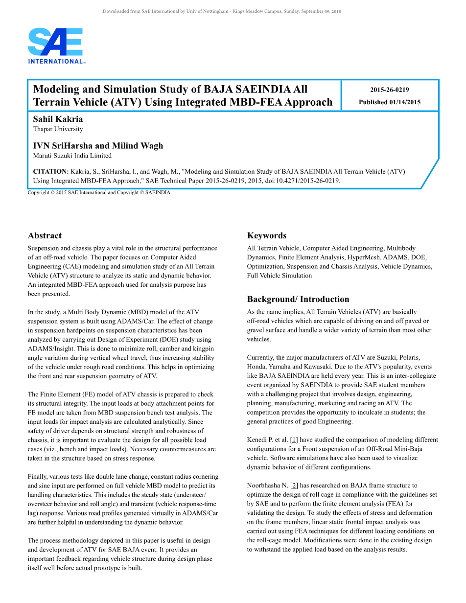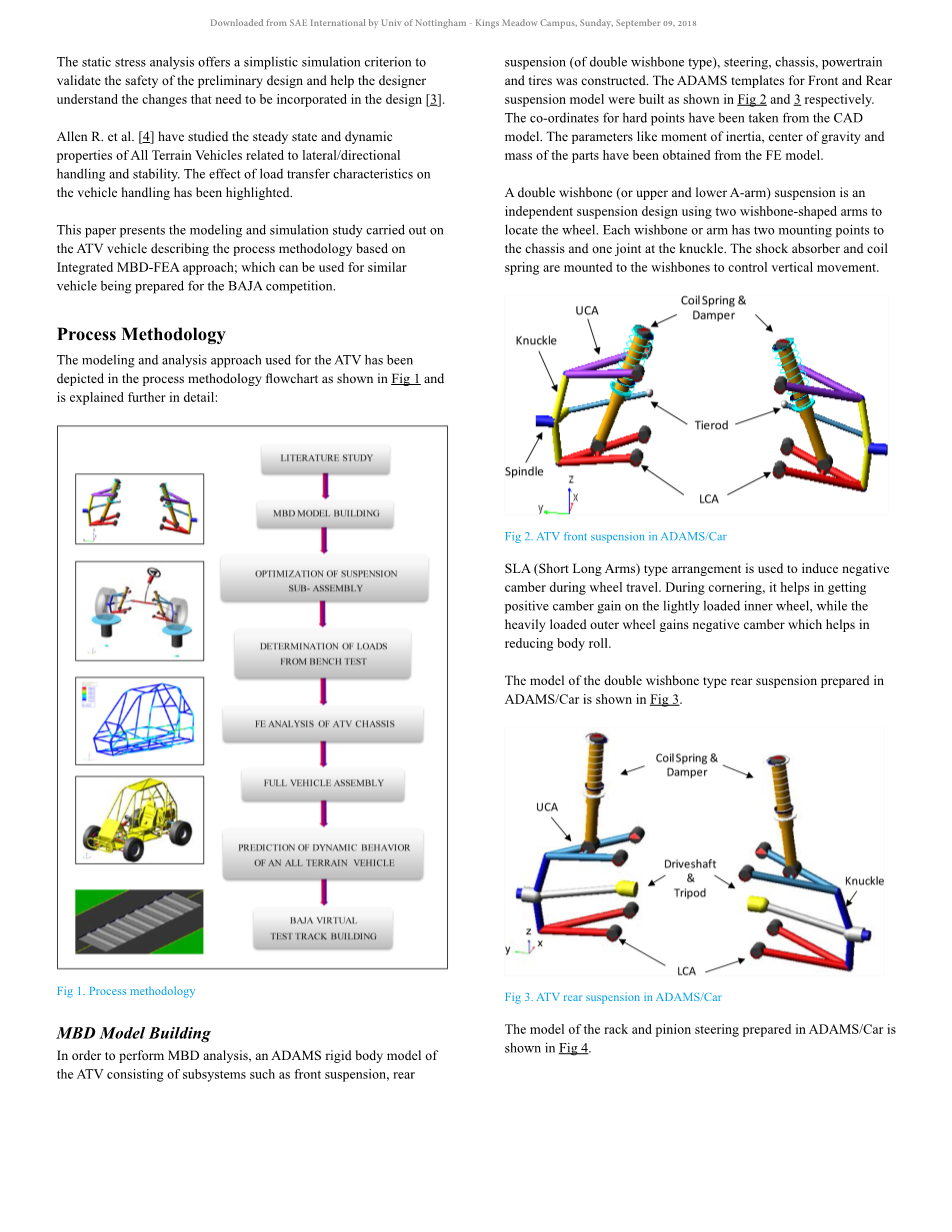 最后,在全车MBD模型上进行了双变道、恒半径转弯和正弦输入等试验,对其进行了预测处理的特点。这包括稳态(转向不足/过度转向行为和滚转角)和瞬态(车辆响应时间滞后)响应。在ADAMS/Car中虚拟生成的各种道路剖面进一步有助于理解动态行为。本文所描述的过程方法对SAE BAJA事件ATV的设计和开发具有一定的参考价值。它提供了一个在实际原型建立之前,在设计阶段对车辆结构本身的重要反馈。
