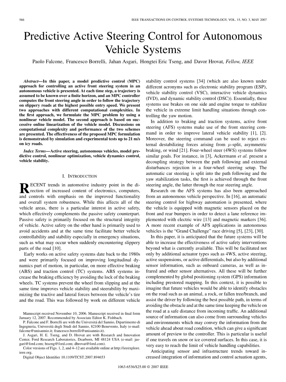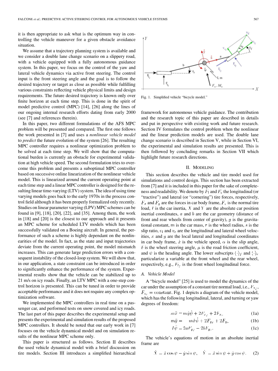 我们假设一个轨迹规划系统是可用的,并且我们考虑在湿滑路面的双车道上变道的场景,车辆配备有完全自主的导航系统。在本文中,我们将重点放在通过主动转向控制偏航和侧向车辆动力学。控制输入是前转向角,目标是尽可能接近期望的轨迹或目标,同时满足反映车辆物理限制和设计要求的各种约束。未来期望的轨迹仅在每个时间步长的有限时间范围内是已知的。这是根据模型预测控制(MPC)[14],[26]理论完成的,与我们2000年初正在进行的内部研究工作(参见文献[7]和其中的参考文献)一致。