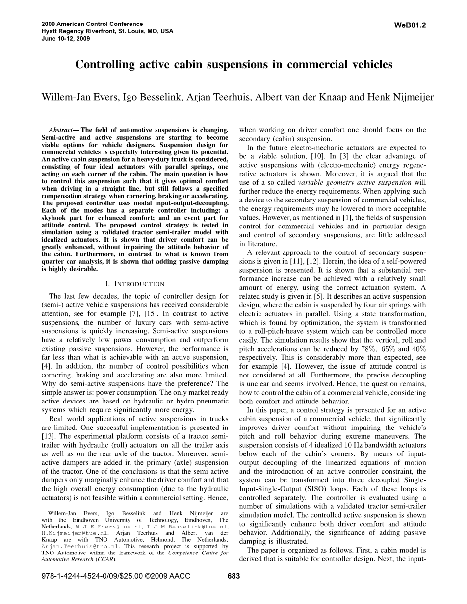摘要:汽车悬架领域正在发生变化。半主动和主动悬架开始成为汽车设计者的可行选择。考虑到它的潜力,商用车的悬架设计尤其令人感兴趣。一种重型卡车主动座舱悬架被认为是由四个理想的执行器与平行弹簧,一个作用于每一个角落的船舱。主要的问题是如何控制这种悬架,使其在直线行驶时获得最佳的舒适性,但在转弯、制动或加速时仍然遵循特定的补偿策略。该控制器采用模态输入输出解耦。每种模式都有一个单独的控制器包括:一个理想舒适的天棚部分;和一个事件的一部分用于姿态控制。仿真结果验证了该控制策略的有效性。结果表明,在不影响座舱姿态特性的前提下,可以大大提高驾驶员的舒适性。此外,与四分之一汽车分析中所知道的相反,它表明增加被动阻尼是非常可取的。
