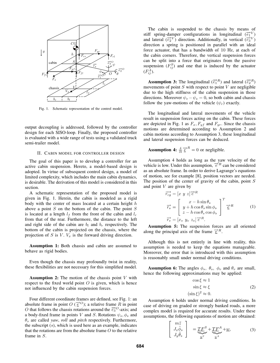船舱是悬浮在底盘的刚性弹簧阻尼器结构在纵向的手段()和横向()方向。此外,在垂直()方向安装有弹簧并联了一个理想的力致动器,具有10赫兹的带宽,每个船舱的角落。因此,垂直悬挂的力量可分为动力来源于被动悬架()和一个由致动器致()。