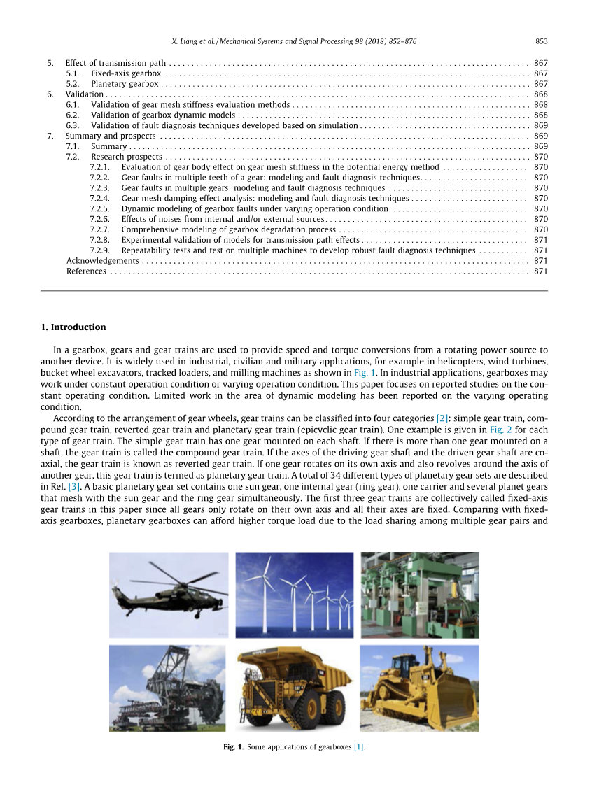 在变速箱中,齿轮和齿轮系用于提供从旋转动力源到另一个设备的速度和转矩转换。 它广泛应用于工业,民用和军事应用,例如直升机,风力涡轮机,斗轮挖掘机,履带式装载机和铣床,如图1所示。在工业应用中,变速箱可以在恒定的运行条件下工作或变化 操作条件。 本文重点报道了关于恒定运行条件的报道。 关于动态建模领域的有限工作已经在不同的操作条件下报告。