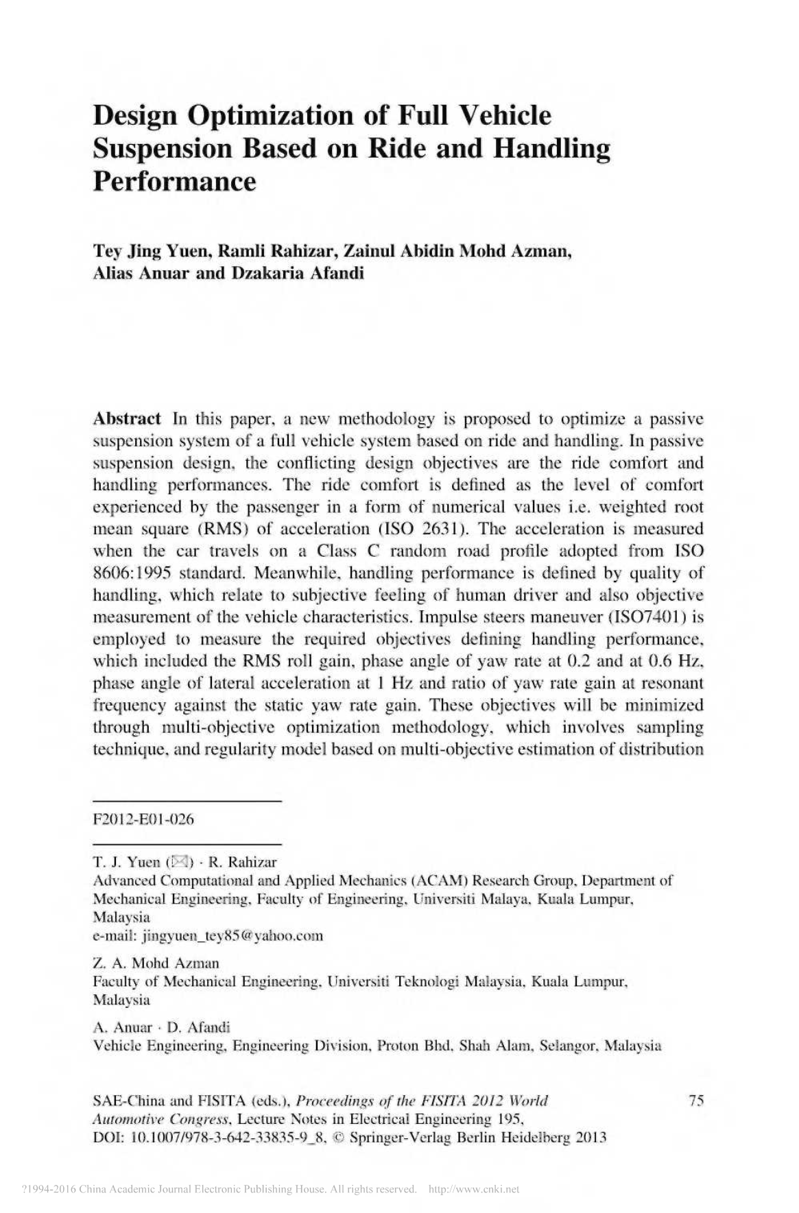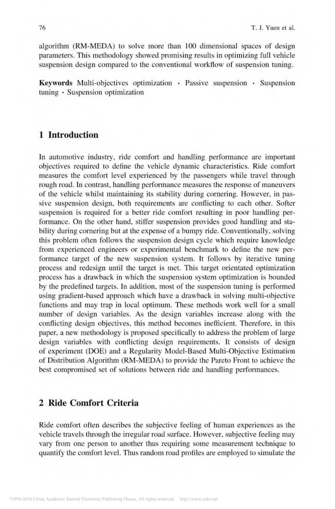 摘要 本文基于平顺性和操纵稳定性方面提出了一种新的方法来优化整车的被动悬架系统。在被动悬架设计中,汽车的平顺性和操纵稳定性存在矛盾。平顺性被定义为乘客的舒适程度,以加权加速度的均方根(RMS)的数值形式(ISO 2631)。当汽车在ISO8606:1995标准采用的C级随机道路轮廓行驶时测量加速度。同时,操纵稳定性由操纵的质量来定义,这涉及到驾驶员的主观感受,也涉及到车辆特性的客观衡量。冲动转向操纵控制(IS07401)是用来衡量所定义操纵稳定性的规定指标,其中包括RMS滚动增益,在0.2 Hz和0.6 Hz时横摆率的相位角,1Hz处的横向加速度的相位角和谐振处的相对于静态横摆率增益的比率频率。这些指标将通过涉及抽样技术的多方面优化技术和基于多方面分布估计算法的规律模型被最小化,来解决超过100个二维空间的设计参数。相比于传统的悬架调校工作流程,这种方法在整车悬架设计优化方面展示了令人满意的结果。