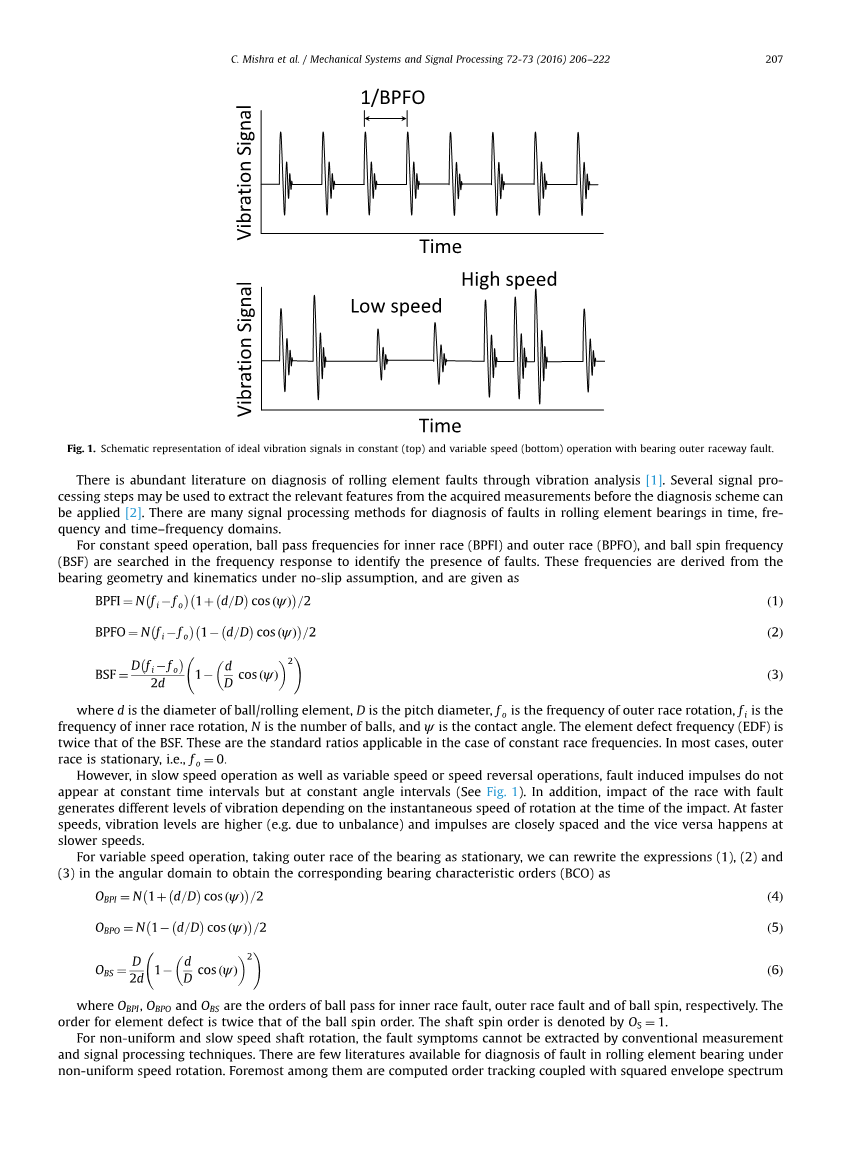 D是滚珠/滚动单元的直径,f是外轮旋转的频率,fi是内轮旋转的频率,N是球的数目,Psi;是接触角。元件缺陷频率(EDF)是BSF的两倍。这些是适用于恒定频率的标准比例。在大多数情况下,外圈是固定的,即f0=0: