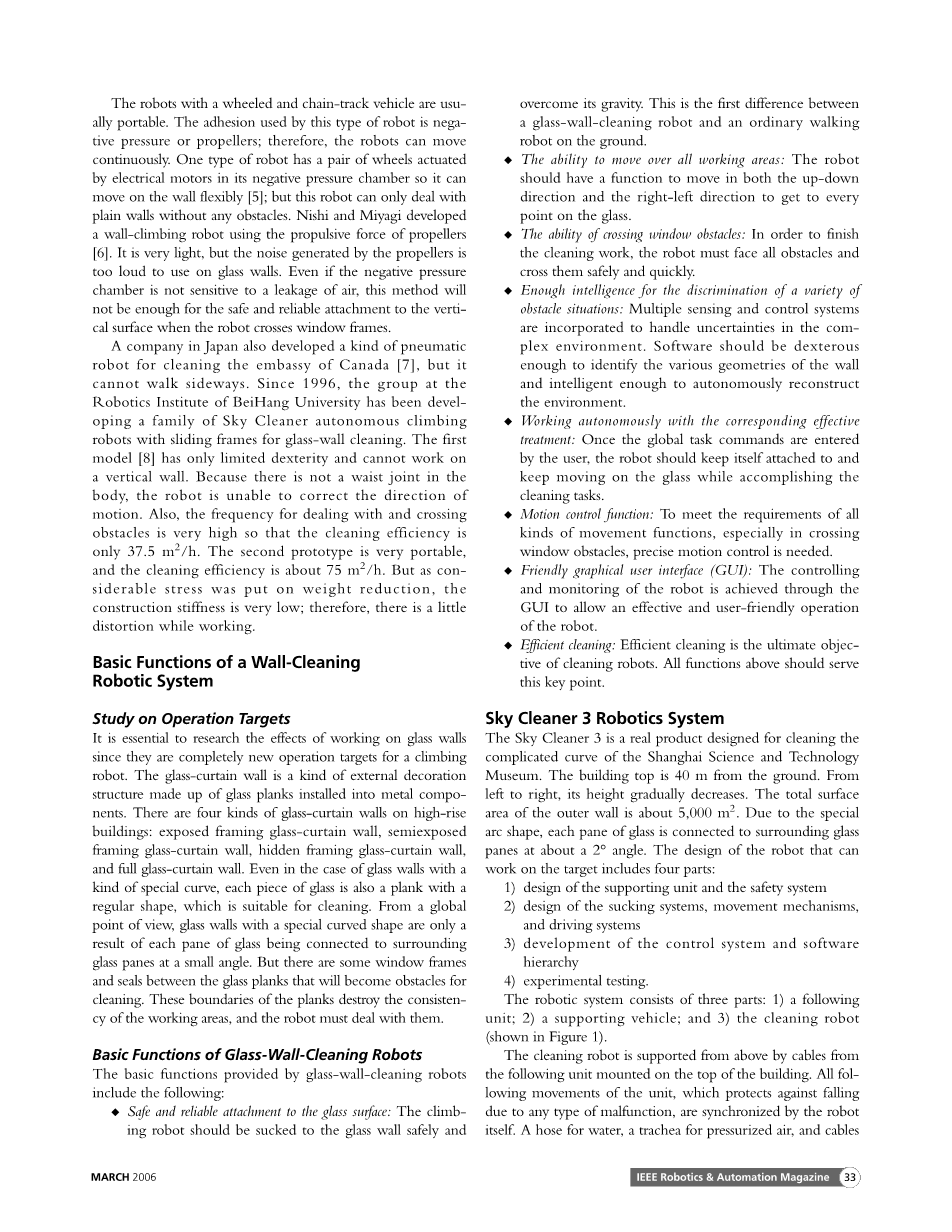 在这篇文章中,讨论的重点是高层建筑的清扫机器人。目前,在现代城市里大量的高层建筑都有玻璃幕墙。这些墙壁需要持续清洁,目前都是在使用永久性吊舱系统进行清洁。在半空中清理高层建筑的外墙始终是危险且费力的工作。由于目前缺乏统一的建筑结构,高层建筑的墙面清洁和维护逐渐成为最适合机器人化的领域之一。步行和攀登技术的发展为上述问题提供了一种新的解决方案。应用这种清洁机器人系统可以将工人从这项危险工作中解放出来,并实现自动清洁高层建筑,从而提高服务业的技术水平和生产力。