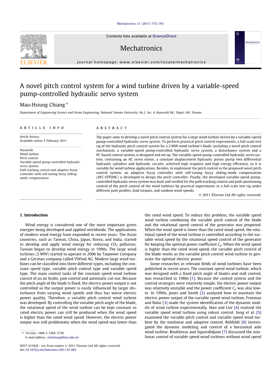 当今大型风力涡轮机的变桨距控制系统由电动机,液压马达或液压缸驱动。由于翼型,电动马达和液压马达驱动系统的驱动需要齿轮,因此抵抗叶片外部干扰的鲁棒性较低。相反,液压缸驱动系统具有更好的耐用性,因为它们需要旋转机构但不需要齿轮。当今风力涡轮机中使用的液压缸驱动系统由液压伺服阀控制,即液压阀控制的伺服系统,该系统响应速度快但能量效率低。本文代替液压阀控制系统,开发了变速电液泵控制系统,该系统由变速AC伺服电动机驱动,用于风力涡轮机的变桨距控制系统。