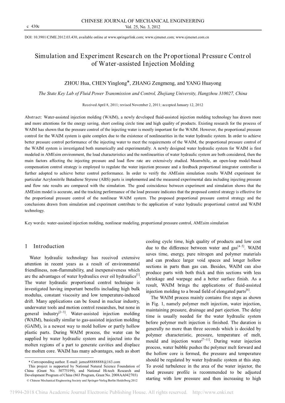 水压技术近年来受到了广泛的关注,其原因其环保,抗燃和成本低,这是水压技术优于油压技术的优势【1】。研究水压比例控制技术具有重要意义,包括高体积模量,恒定粘度和低温漂移。在核工业,水下工具和运动控制研究都有许多应用,但在一般工业中却鲜有成效【2-3】。水辅注塑成型(WAIM)类似于气体辅助注塑成型(GAIM),是制造中空或部分中空塑件最新方法。在WAIM过程中,水可以通过水压系统供应并注入到部件的熔化区域中以产生空腔,也可以移动到熔化部分的核心。由于水和气体的不同【4-5】,WAIM技术有很多优势,例如缩减冷却时间,提高产品质量和降低成本。WAIM节省时间,能源,纯氮和聚合物材料,并且可以产生比气体更大的空隙空间和更长的中空部分。此外,WAIM还可生产厚薄部分,并且具有收缩率小,翘曲小,表面光洁度好的特点。因此,WAIM将液体辅助注塑成型的应用带到了更广泛的细长件领域【6】。