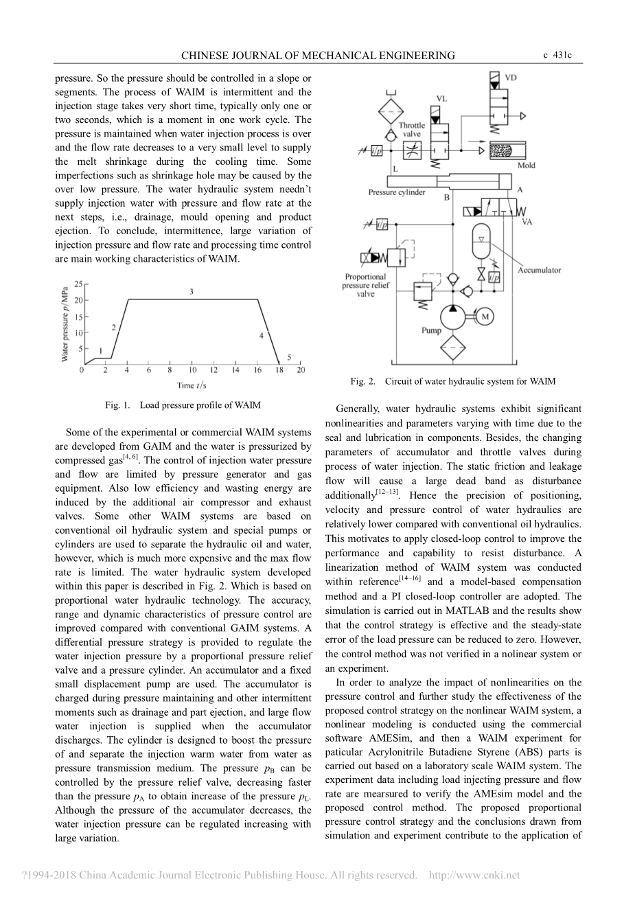 通常,由于部件中的密封和润滑,水压系统显示出显着的非线性和参数随时间变化。此外,注水过程中蓄能器和节流阀的参数变化。另外静摩擦和泄漏流动会引起较大的死区作为干扰【12-13】。因此,与传统的油压液压系统相比,水压系统的定位精度,速度和压力控制相对较低。这激励应用闭环控制来提高抵抗扰动的性能和能力。WAIM系统的线性化方法在参考文献【14-16】中进行,并采用基于模型的补偿方法和PI闭环控制器。在MATLAB中进行仿真,结果表明控制策略是有效的,负载压力的稳态误差可以降到零。但是,该控制方法未在非线性系统或实验中验证。