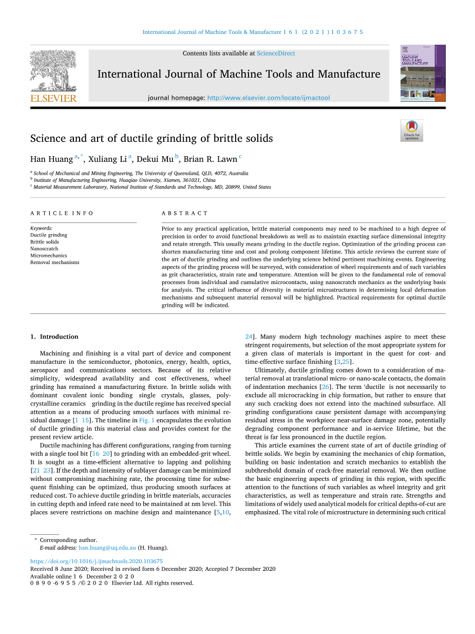 在任何实际应用之前,脆性材料部件可能需要加工到高精度,以避免功能击穿,并保持精确的表面尺寸完整性和保持强度。这通常意味着在韧性区域进行磨削。优化磨削工艺可以缩短制造时间和成本,延长零件寿命。本文回顾了延性磨削技术的现状,并概述了相关加工事件背后的基础科学。磨削过程的工程方面讲进行调查,并考虑到车轮的要求和诸如砂砾特性、应变率和温度等变量。将注意从单个和累积微接触中去除过程的基本作用,使用纳米划痕力学作为分析的基础。材料微观结构多样性在确定局部变形机制和随后的材料去除方面的关键影响将被强调。将指出最佳延性磨削的实际要求。