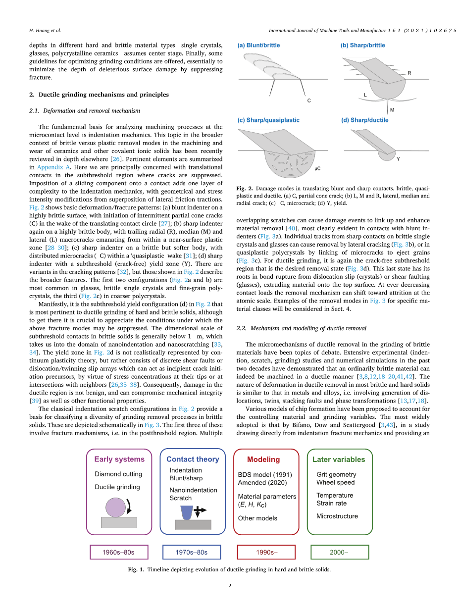 最终,延性磨削归结为考虑在平移微纳米尺度接触时的材料去除,这是压痕力学的领域[26]。术语“延展性”不一定是排除切削形成中的所有微裂纹,而是确保任何此类裂纹都不会延伸到机加工的次表面。所有的研磨配置都会导致伴随的持续损坏工件表面损伤区附近的残余应力,可能会降低组件性能和使用寿命,但在延伸区,威胁远没有那么明显。