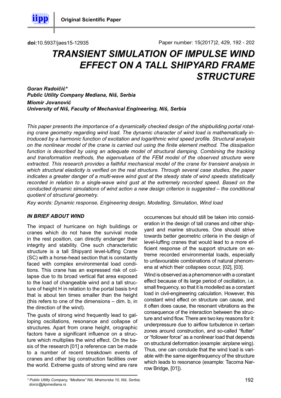 本文介绍了造船厂门座起重机几何形状的动态检查设计对风荷载的重要性。风荷载的动态特性在数学上由激励和对数风速剖面的谐波函数引入。采用有限元法对起重机非线性模型进行了结构分析。通过使用适当的结构阻尼模型来描述能量损耗。结合跟踪和变换的方法,提取出被测结构的有限元模型的特征值。该研究为起重机提供了可靠的机械模型,用于瞬态分析,其中结构的弹性在实际结构上得到验证。通过几个案例研究,本文表明,在极速记录的速度下,相对于单波阵风,统计记录的风速稳定状态下多波阵风的危险性更大。基于风作用的传递动态模拟,提出了一种新的设计标准 - 几何结构的的条件商。