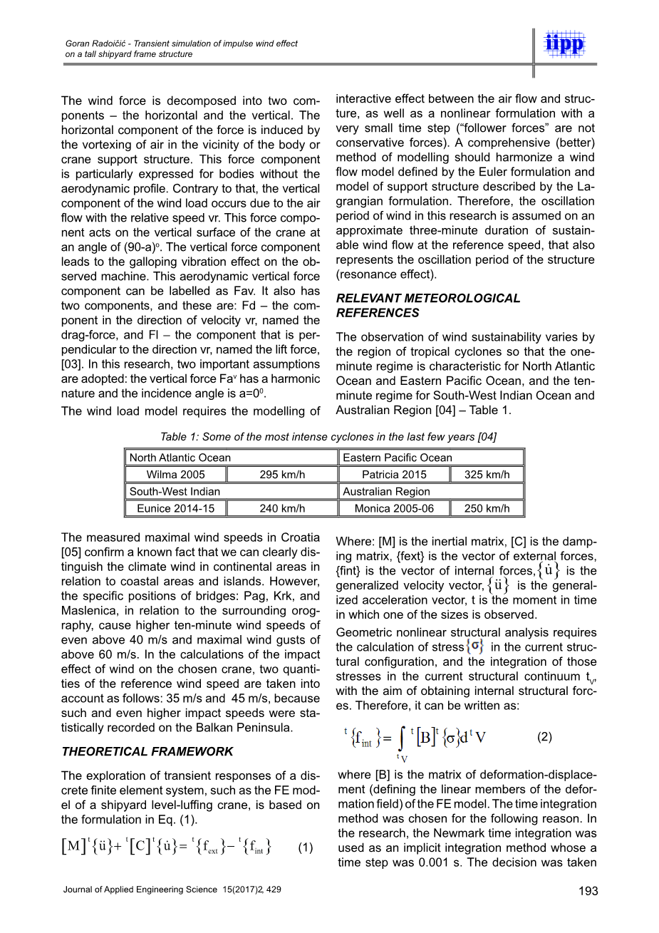 其中:Ra = 1.225kg / m3是150℃温度下干燥空气的空气密度; Cs是形状系数(根据直到最近有效的标准SRPS U.C7.113); Ai [m2]是每个观察到结构元件的表面(高度为zi的基本表面); v = U(z)[m / s]是每个观测高度z的风速,考虑到地理降雨粗糙度z0; a = 00是风效应方向与结构观测构件表面法向之间的角度(如果风垂直作用于表面,则a=00,cosa=1)。为了计算给定高度z处的垂直风廓线,对数剖面模型,符合标准[14]和10分钟速度的平均条件U(Href)在参考 - 195Goran Radoi膷i膰 - 对高大造船厂框架结构的脉冲风效应的瞬态模拟,429应用工程科学15(2017)2 Href高度= 10 m这里使用对数风速剖面定义为:
