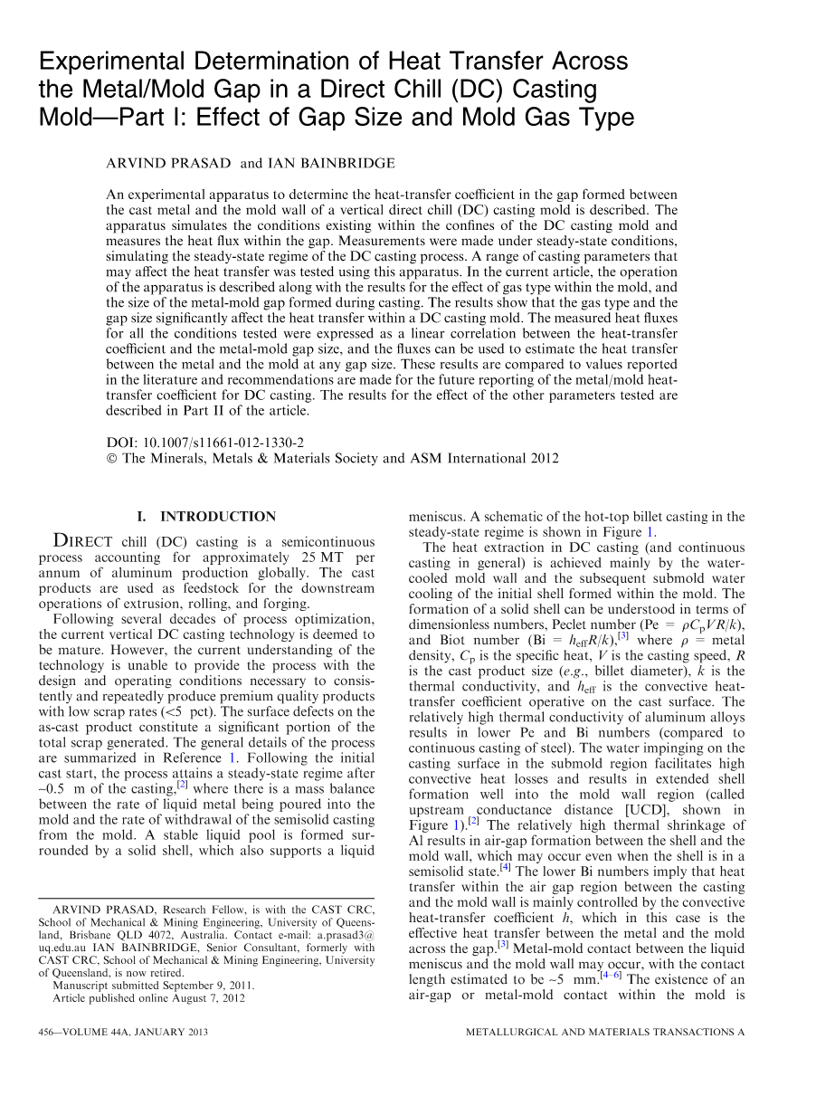 内容摘要:本文介绍了一种在铸造金属和半连续浇铸模的模壁之间形成的间隙中的传热系数的实验装置。该装置模拟半连续铸模范围内存在的条件,并测量间隙内的热通量。在稳态条件下进行测量,模拟半连续铸造过程的稳态状态。使用该装置测试了可能影响传热的一系列铸造参数。文中描述了该装置的操作以及模具内气体类型的影响的结果,以及在铸造期间形成的金属模具间隙的尺寸。结果表明,气体类型和间隙尺寸显着影响直流铸造模具内的传热。所有测试条件下测得的热通量表示为传热系数与金属模间隙尺寸之间的线性关系,通量可用于估算金属与模具之间任何间隙尺寸的热传递。将这些结果与文献中报道的值进行比较,并建议未来报告半连续铸造的金属/模具热传递系数。