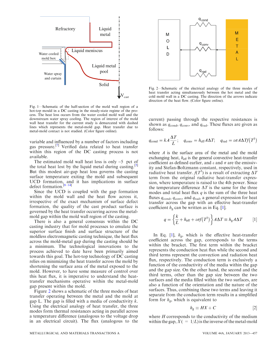 半连续铸造(和一般的连续铸造)中的热量提取主要通过水冷模具壁和随后在模具内形成的初始壳体的亚模水冷来实现。固体壳的形成可以用无量纲数,佩克莱数(Pe = qCpVR / k)和毕渥数(Bi = heffR / k)来理解,其中q =金属密度,Cp是比热,V是铸造速度,R是铸造产品尺寸(例如,坯料直径),k是导热率,并且heff是在铸造表面上可操作的对流传热系数。铝合金的相对高的导热性导致较低的Pe和Bi数(与连续铸造钢相比)。冲击在亚模区域中的铸造表面上的水有利于高对流热损失并且导致壳体形成延伸到模具壁区域中(称为上游传导距离[UCD],如图1所示)。Al的相对高的热收缩导致壳和模具壁之间形成气隙,即使壳处于半固态时也可能发生这种气隙。较低的Bi数意味着铸件和模具壁之间的气隙区域内的热传递主要由对流传热系数h控制,在这种情况下,对流传热系数h是金属和模具之间跨越间隙的有效热传递。液体弯月面和模具壁之间可能发生金属模接触,接触长度估计为5 mm。模具内气隙或金属模具接触的存在是可变的和受影响的由许多因素造成的,包括气体压力。在半连续铸造工艺的该区域内与热传递相关的验证数据不可用。