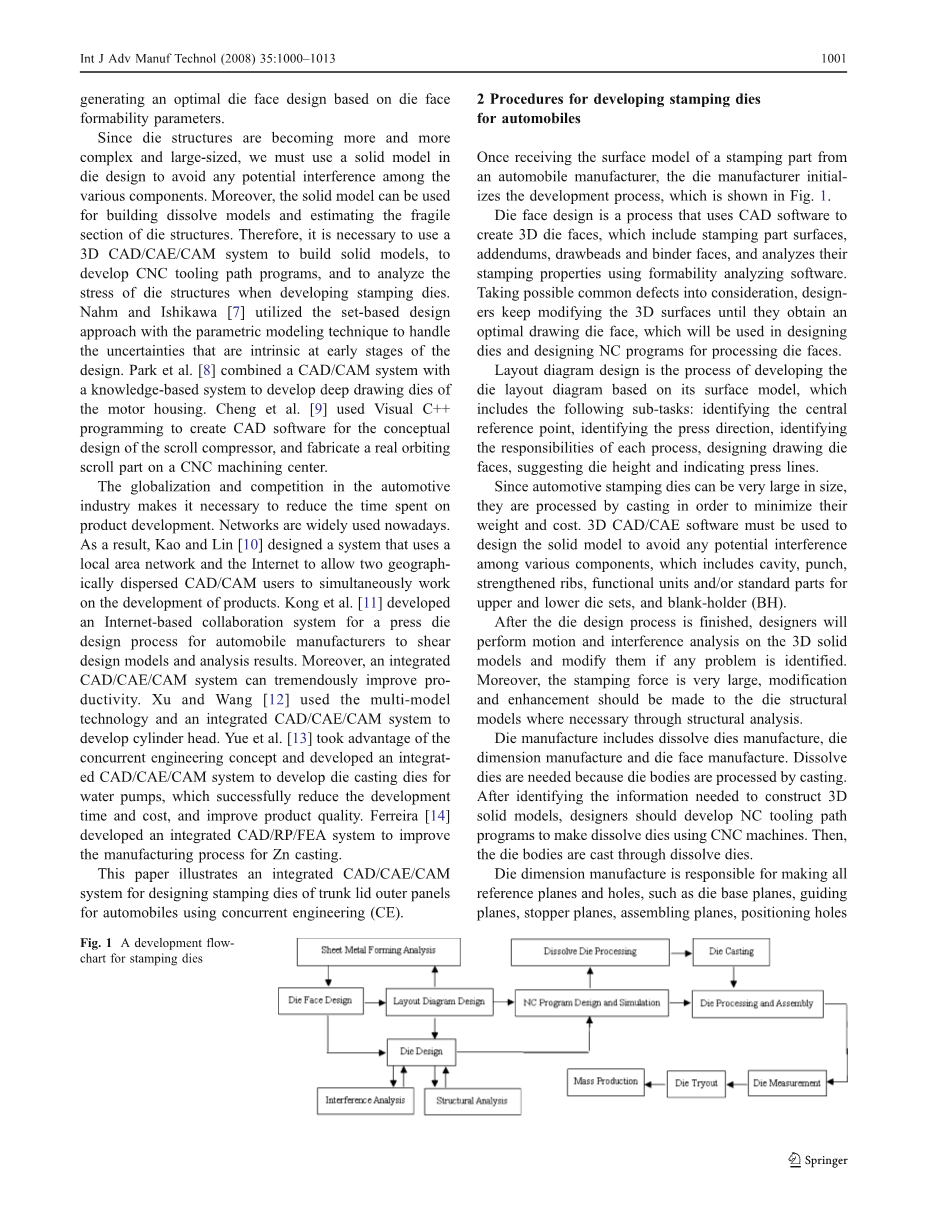 由于芯片结构变得越来越复杂,我们必须在芯片设计中使用实体模型以避免各种元件之间的任何潜在干扰。此外,实体模型可用于构建溶解模型和估计模具结构的脆弱部分。因此,有必要使用3D CAD/CAE/CAM系统来构建实体模型,开发CNC工具路径程序,并在开发冲压模具时分析模具结构的应力。Nahm和Ishikawa利用基于集合的设计方法和参数化建模技术来处理设计早期阶段固有的不确定性。Park等将CAD/CAM系统与基于知识的系统相结合,开发出电机外壳的深冲模。程等人使用 Visual C 编程为涡旋压缩机的概念设计创建CAD软件,并在CNC加工中心制造一个真实的轨道涡旋部件。