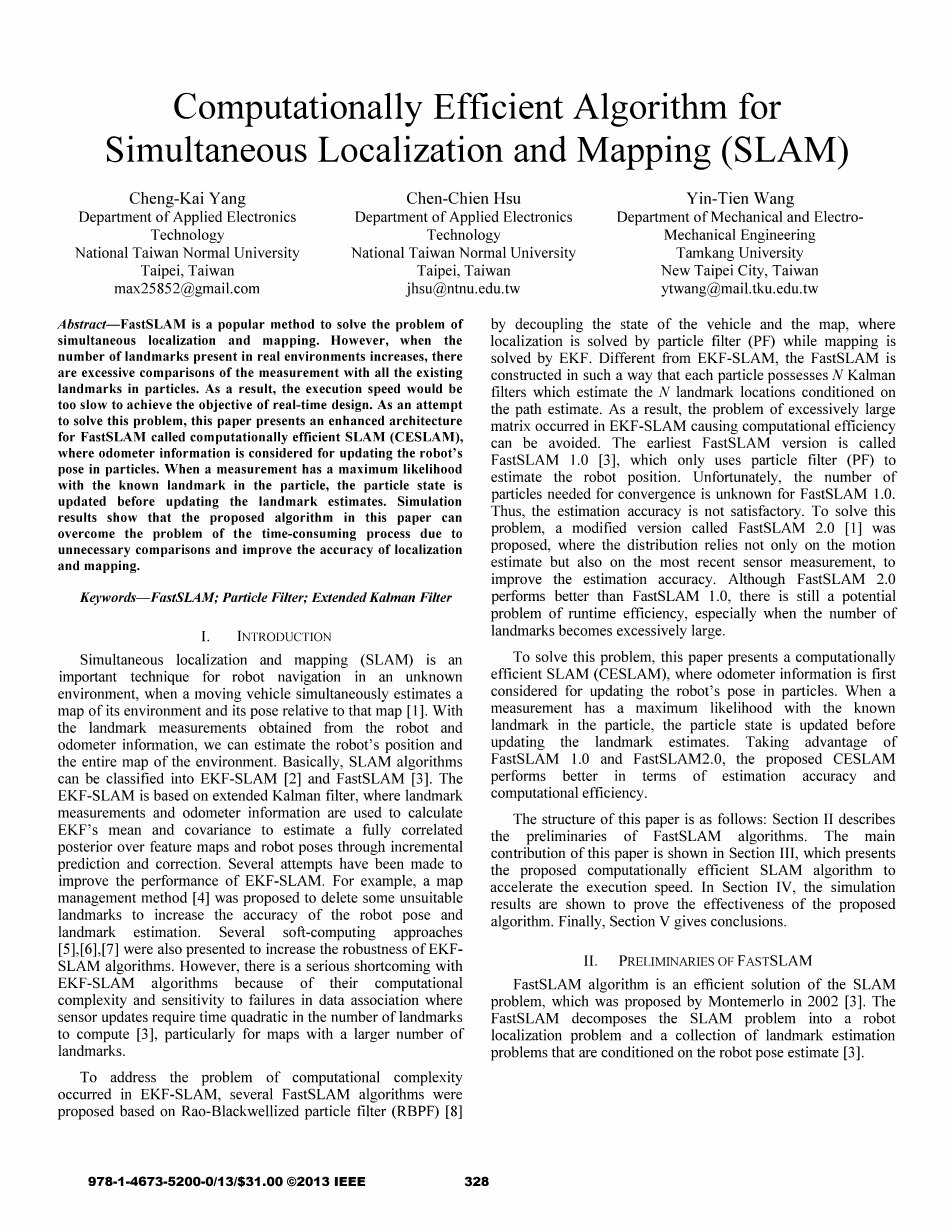 摘要——Fastslam是一种解决同时定位和映射问题的常用方法。然而,在实际环境中,当标志物的数量大大增加时,测量值与粒子所对应的标志物之间存在对比过多,导致了执行速度太慢,因而无法达到实时设计的目的。为了解决这一问题,本文提出了一种FastSLAM的增强算法,称为计算有效SLAM(CESLAM),其中里程计信息被用来更新机器人在粒子图像的状态。当测量与粒子中已知地标具有最大可能数值时,将在更新编辑估算之前更新粒子的状态。最后仿真结果表明,本文提出的算法可以克服不必要的对比带来的额外耗时的问题,从而提高定位和映射的精度。