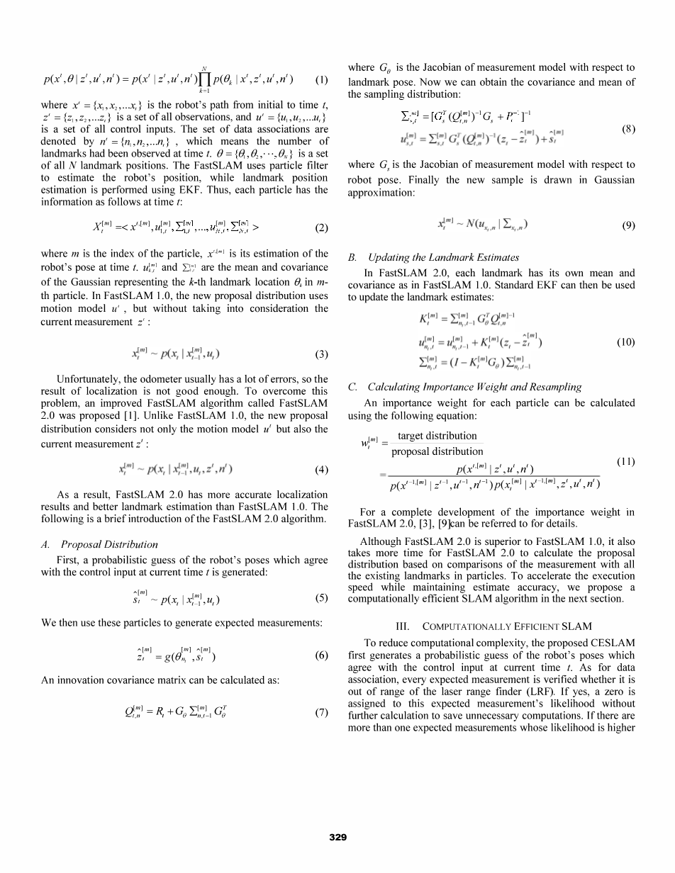 其中m是粒子的指数,x,,]m)是它对机器人在t.ut;1和l时的姿势是平均值和协方差,代表第k个地标位置的高斯分布(单位:mth)微粒。在Fastslam 1.0中,新的提案分发使用运动模型Ursquo;,但不考虑电流测量Z#39;: