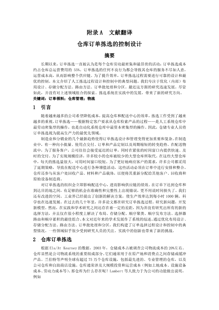 Abstract: Order picking has long been identified as the most labour-intensive and costly activity for almost every warehouse; the cost of order picking is estimated to be as much as 55% of the total warehouse operating expense. Any underperformance in order picking can lead to unsatisfactory service and high operational cost for its warehouse, and consequently for the whole supply chain. In order to operate efficiently, the orderpicking process needs to be robustly designed and optimally controlled. This paper gives a literature overview on typical decision problems in design and control of manual order-picking processes. We focus on optimal (internal) layout design, storage assignment methods, routing methods, order batching and zoning. The research in this area has grown rapidly recently. Still, combinations of the above areas have hardly been explored. Order-picking system developments in practice lead to promising new research directions.