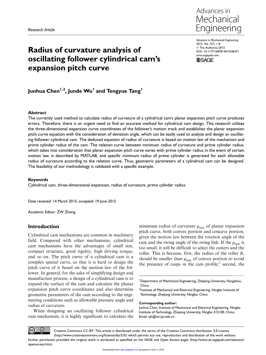 圆柱凸轮机构是机械领域中常见的机构。与其他机构相比,圆柱凸轮机构具有体积小、结构紧凑、刚性好、驱动力矩大等优点。圆柱凸轮的节曲线是一条复杂的空间曲线,很难根据从动件的运动规律来设计其节曲线。一般来说,为了简化设计和制造过程,圆柱凸轮的设计是对凸轮表面进行展开,计算平面展开螺距曲线坐标,并根据许用压力角和曲率半径等工程条件确定凸轮的几何参数。在设计摆动从动件圆柱凸轮机构时,考虑到凸轮的旋转角度与摆动角度之间的运动规律,计算平面扩展节距曲线的最小曲率半径rho;min(包括凸起部分和凹入部分)是非常重要的。如果rho;min太小,则难以选择切割器和滚子。 这是因为以下原因,首先,滚子的半径Rr应小于凸起部分的rho;min,以避免凸轮轮廓中存在尖点。第二,加工凸轮廓线的刀具半径Rt应小于凹入部rho;min,以避免刀具与凸轮廓线的干涉,减少切削力和剧烈振动。然而,如果Rho;MIN太大,会导致凸轮机构尺寸过大,这意味着惯性力较大,可能导致凸轮与从动件之间的接触力和应力较高。因此,迫切需要找到一种合适的方法来计算圆柱凸轮平面膨胀节曲线的曲率半径。此外,最小曲率半径rho;min与圆柱凸轮的主圆柱半径R有关,因此,确定rho;min与R的关系曲线也很重要。