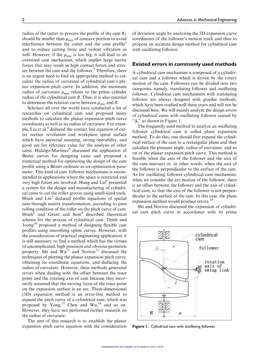 世界各国学者对圆柱凸轮进行了大量的研究,提出了许多计算平面膨胀节曲线坐标及其曲率半径的方法。例如,liu等推导出了具有普遍意义、可操作性强、对其它凸轮分析有较好参考价值的刀面旋转和工件螺旋面的接触线方程。Hidalgo-Martı#39;nez讨论了Be#39;zier曲线在凸轮设计中的应用,并提出了一种使用Be#39;zier纵坐标作为优化参数来优化凸轮轮廓设计的数值方法。这种凸轮-随动机构推荐用于空间受限和涉及非常大力的应用场合。Hung和Lai提出了一种使用小型工具切割滚子槽的圆柱凸轮设计和制造系统。根据凸轮节曲线上滚子的纯滚动条件,Hsieh和lin通过矩阵变换,推导了空间凸轮的廓线方程。Hsieh和Grant和Soni描述了制造圆柱凸轮过程的理论方案。Thinh和Joong提出了一种利用平滑样条曲线设计柔性凸轮廓线的方法。然而,考虑到实际工程应用,仍有必要寻找一种简单、精度高、几何性质明显的方法。Shi和WU以及Norton讨论了绘制平面膨胀节曲线、获取其坐标方程以及推导曲率半径的技术。然而,这些方法在处理轨迹点与凸轮旋转轴之间的偏移时会产生误差,因为它们错误地假定了轨迹点在膨胀面上的运动轨迹是一条圆弧。三维展开法是由Yong、 Chen、Wu等提出的一种无误差展开圆柱凸轮节曲线的方法。然而,他们还没有对曲率半径进行进一步的研究。