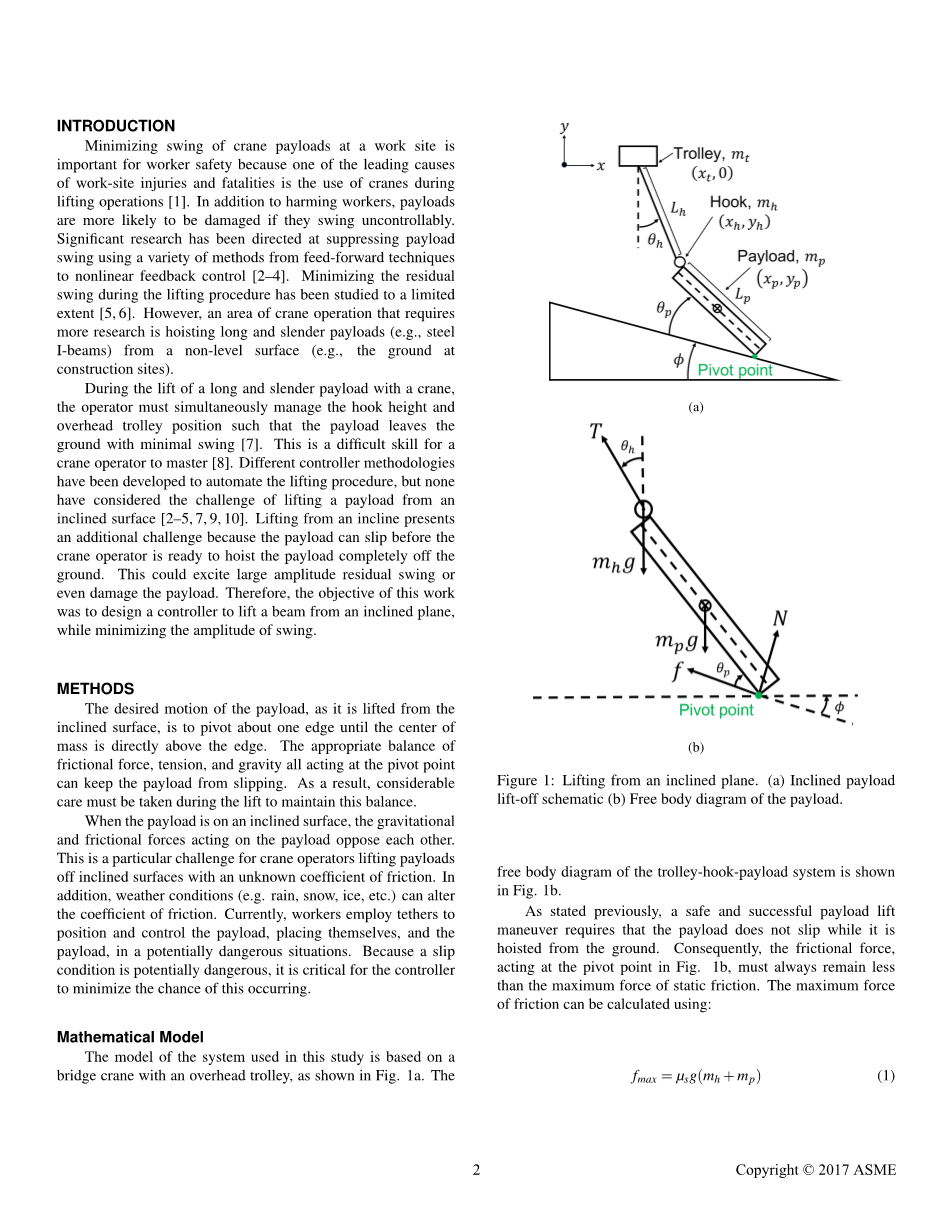 在使用起重机提升长而细的载荷时,操作者必须同时管理吊钩的高度和顶部的小车位置,这样负载就会以最小的摆动离开地面[7]。对于起重机操作员来说,这是一项难以掌握的技能[8]。已经开发了不同的控制器方法来自动化提升过程,但是没有人考虑到从倾斜的表面提升负载的挑战[2-5,7,9,10]。从倾斜角度出发会带来额外的挑战,因为在起重机操作员准备好将负载完全从地面升起之前,负载可以滑动。这可能会激发巨大的振幅剩余摆动,甚至会损坏负载。因此,这项工作的目标是设计一个控制器来从倾斜的平面上抬起一个角度,同时尽量减小摆动幅度。