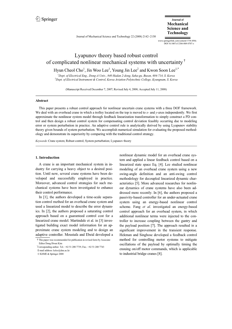 【关键词】:起重机系统;鲁棒控制;系统摄动;Lyapunov理论
