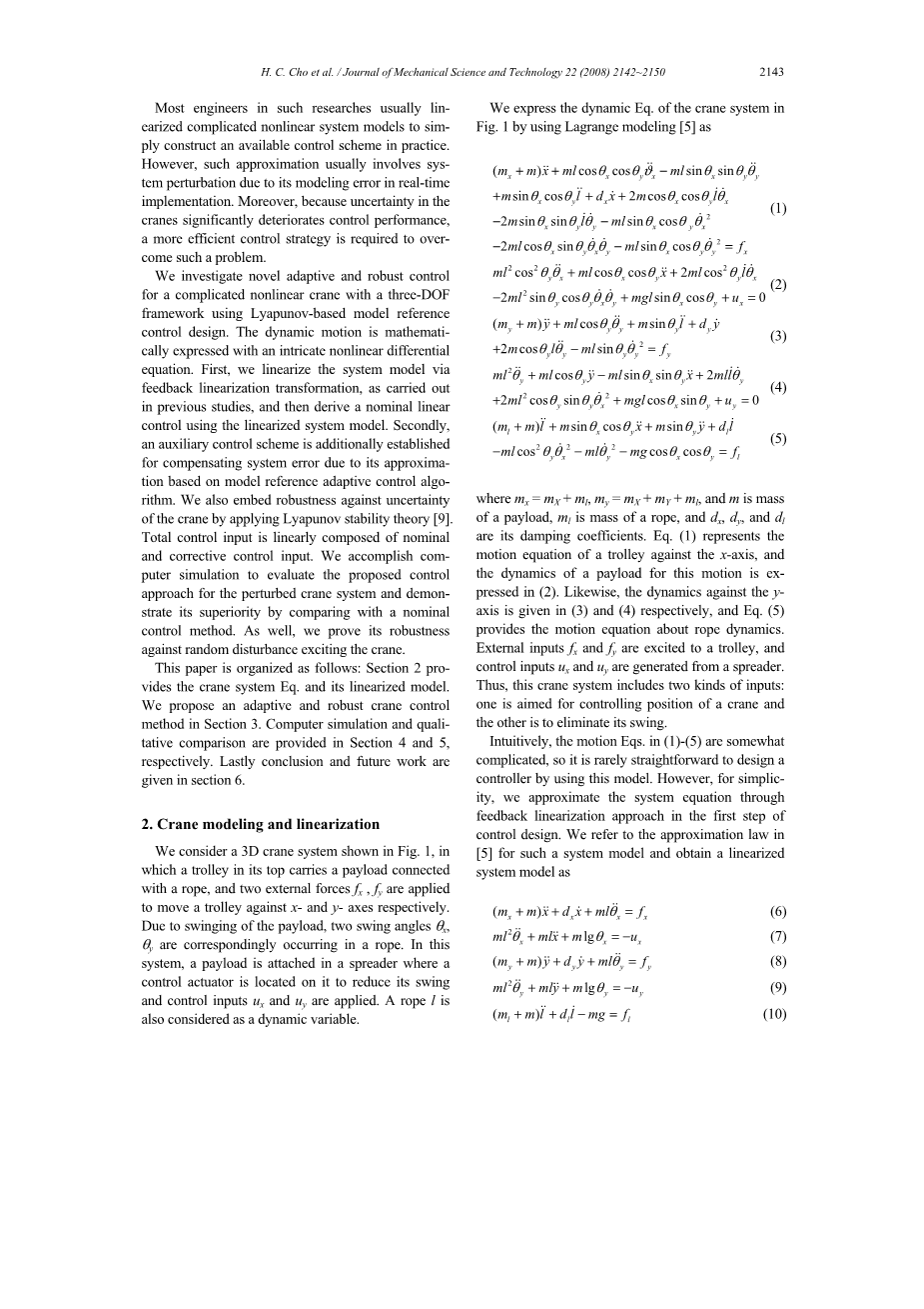 本文的结构如下:第2节提供了起重机系统平衡方程及其线性化模型,我们在第3节提出了一种自适应和鲁棒的起重机控制方法。计算机模拟和定性比较分别在第4和第5节中提供。最后,第6节给出了结论和今后的工作。