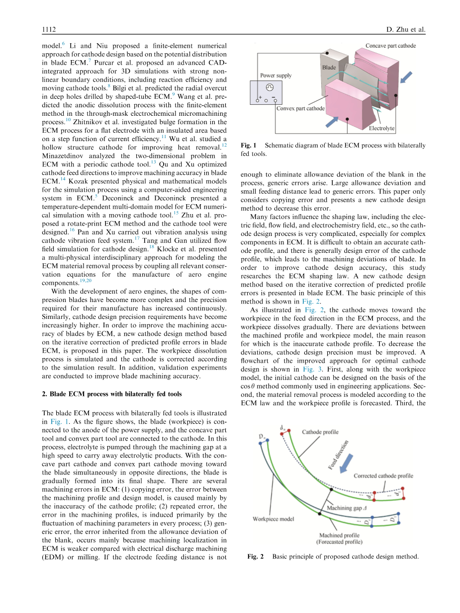 使用双向进给刀具的刀片ECM过程如图1所示。如图所示,刀片(工件)连接到电源的阳极,并且凹部工具和凸部工具连接到阴极。在该过程中,电解质以高速泵送通过加工间隙以携带电解产物。随着凹部阴极和凸部阴极同时沿相反方向朝向叶片移动,叶片逐渐形成为其最终形状。 ECM中存在几个加工误差:(1)复制误差,加工轮廓和设计模型之间的误差主要由阴极轮廓的不准确性引起; (2)重复误差,加工轮廓的误差,主要是由于每个过程中加工参数的波动; (3)通用误差,从毛坯的允许偏差继承的误差主要是因为与放电加工(EDM)或铣削相比,ECM中的加工局部化较弱。如果电极进给距离不足以消除毛坯在工艺中的余量偏差,则会出现一般的错误。大的容差偏差和小的进给距离导致一般错误。本文只考虑复制误差,并提出一种新的阴极设计方法来减少这种误差。