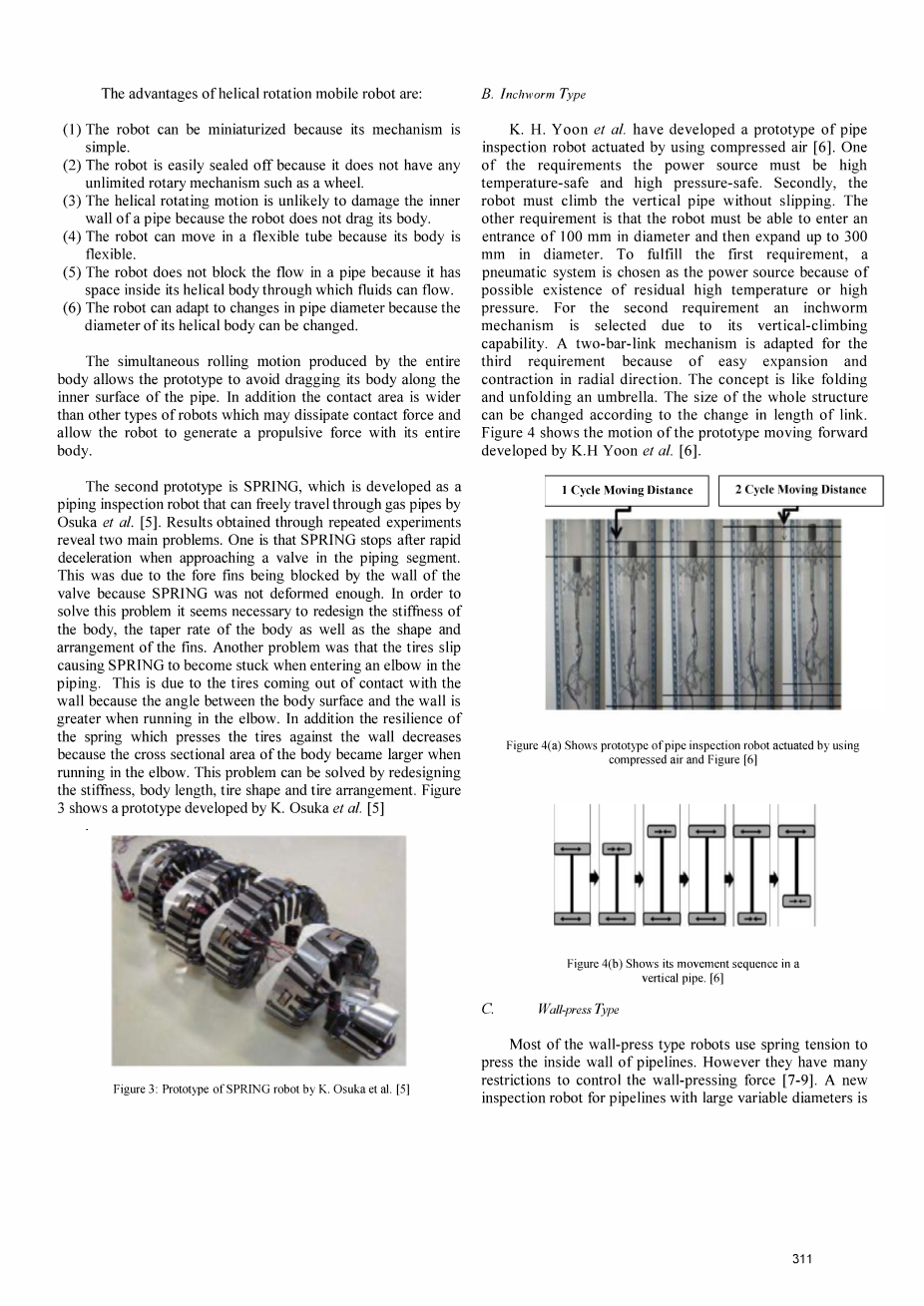 在第二节中, 对管道检测机器人的几种类型进行了简要的说明。讨论了机理、控制方法、驱动仪表以及与检测装置的集成。