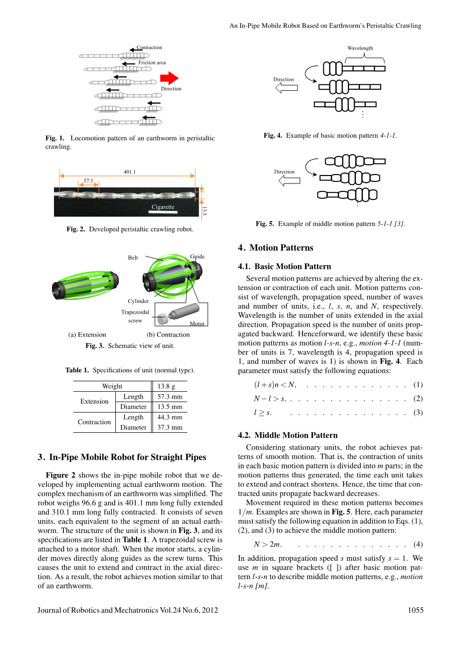 几种运动模式可以减少每个单元的伸缩。 运动模式由波长,传播速度,波的数量和单元数量组成,即分别为l,s,n和N. 波长是沿轴向延伸的单位数。 传播速度是向后传播的单位数量。 因此,我们将这些基本运动模式确定为运动lsn,例如运动4-1-1(单元数为7,波长为4,传播速度为1,波数为1)如图4所示。 每个参数有以下等式: