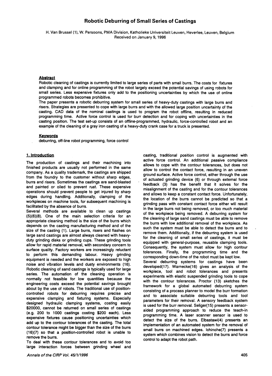 机器人的铸件清理目前仅限于具有小毛刺的大系列零件。机器人的固定和夹紧以及在线编程的成本大大超过了小批量使用机器人的潜在成本。较便宜的固定装置只会增加定位的不确定性,因此无法使用在线编程的机器人。本文提出了一种用于大型系列小毛刺浇冒口的重型铸件的自动去毛刺系统。提出了应对毛刺和允许的较大铸件位置不确定性的策略。标称铸件的CAD数据用于离线编程机器人,从而减少了编程时间。主动力控制用于毛刺检测和应对铸造位置的不确定性。该测试装置由离线编程的液压受力控制机器人组成,并提供了清洁卡车重型曲轴箱灰口铸铁的示例。