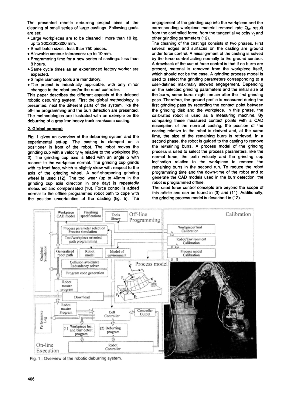 铸件的生产及其最终产品的机加工通常不在同一家公司进行。作为优质商标,铸件从铸造厂运送到客户,没有锋利的边缘,毛刺和冒口。有时,铸件会被喷砂,喷漆或上油以防止生锈。这些昂贵的操作应防止人员在搬运过程中被锋利的边缘伤害。另外,由于没有毛刺,因此便于将工件夹紧在机床上,以进行后续加工。有几种方法可以清理铸件(5)(6)(8)。合适的清洁方法的主要选择标准之一是毛刺的大小,其大小取决于铸件的制造方法和铸件(1)的大小。大型砂铸件上的大毛刺,冒口和毛边几乎总是使用重型砂轮或砂轮进行清洁。这些磨削工具可快速去除材料,其次是表面质量。工厂工人越来越不愿执行这种艰巨的劳动。需要重型研磨设备,并且工人要承受高噪声和高振动水平以及多尘环境(16)。大型铸件通常使用机器人清洁铸件。对于少量生产,清理操作的自动化通常是不可行的,因为工程成本超过了使用机器人带来的潜在节省。传统上使用位置控制机器人进行去毛刺需要精密且昂贵的夹紧和固定系统。专门设计的液压夹紧系统很容易花费20000美元,无法在少量铸件上退回(例如200至1000个铸件,每个铸件200美元)。较便宜的固定装置会导致定位不确定性,这些不确定性会增加铸件的轮廓公差。总轮廓公差可能大于毛刺(16)(7)的大小,以使位置控制机器人无法去除毛刺。为了解决这些轮廓公差并避免砂轮和铸件之间的相互作用力过大,传统的位置控制会增加主动力控制。附加的被动柔度允许应对轮廓公差,但不允许控制接触力,从而导致地面不平整。通过使用致动的研磨装置(6)或通过外力反馈(3)进行主动力控制,具有以下优势:可以解决铸件的不对准问题和轮廓公差问题,并可以保持恒定的接触力。遗憾的是,无法预测毛刺的位置,以致在恒定接触力的情况下进行磨削会导致大毛刺无法去除,或者工件的材料过多。用于清洁大型砂型铸件的去毛刺系统必须能够去除毛刺,且工件的额外去除率较低。因此,系统必须能够检测并去除毛刺。此外,如果使用去毛刺系统清理少量铸件,则必须配备通用的可重复使用的夹紧工具。因此,系统必须允许较高的轮廓公差。最后,机器人的编程时间和相应的停机时间必须保持较低。已经开发了几种铸件去毛刺系统(17)。 Warnecke(16)对工件,工具和机器人的公差进行了分析,并提出了使用弹性悬浮磨削工具来应对轮廓公差的实验。 Proctor(13)概述了一个全球自动去毛刺系统的框架,该系统由一个工艺计划员组成,以对毛刺形成进行建模,并关联适当的去毛刺工具和工具参数以将其去除。感觉反馈系统用于去除毛刺。 Seliger(15)提出了一种传感器辅助编程方法,以减少示教编程时间。激光扫描仪传感器用于检测毛刺的大小。 Elbastawi(4)介绍了一种自动化系统的实现,该系统用于去除机加工边缘上的小毛刺。 Ichinohe(7)提出了一个结合视觉检测毛刺和控制机器人适应路径的系统。提出的机器人去毛刺项目旨在清理少量的大型铸件。 设定了以下目标: