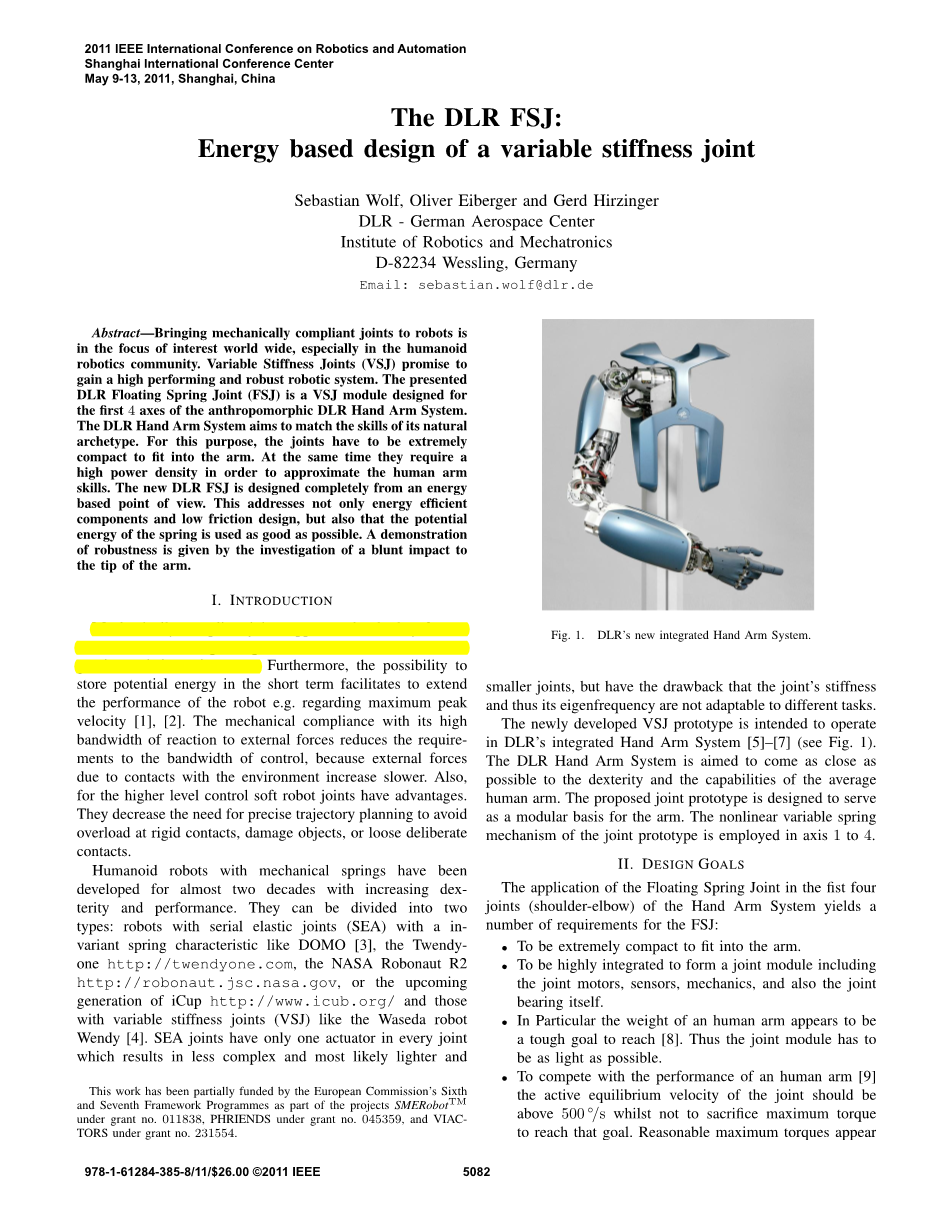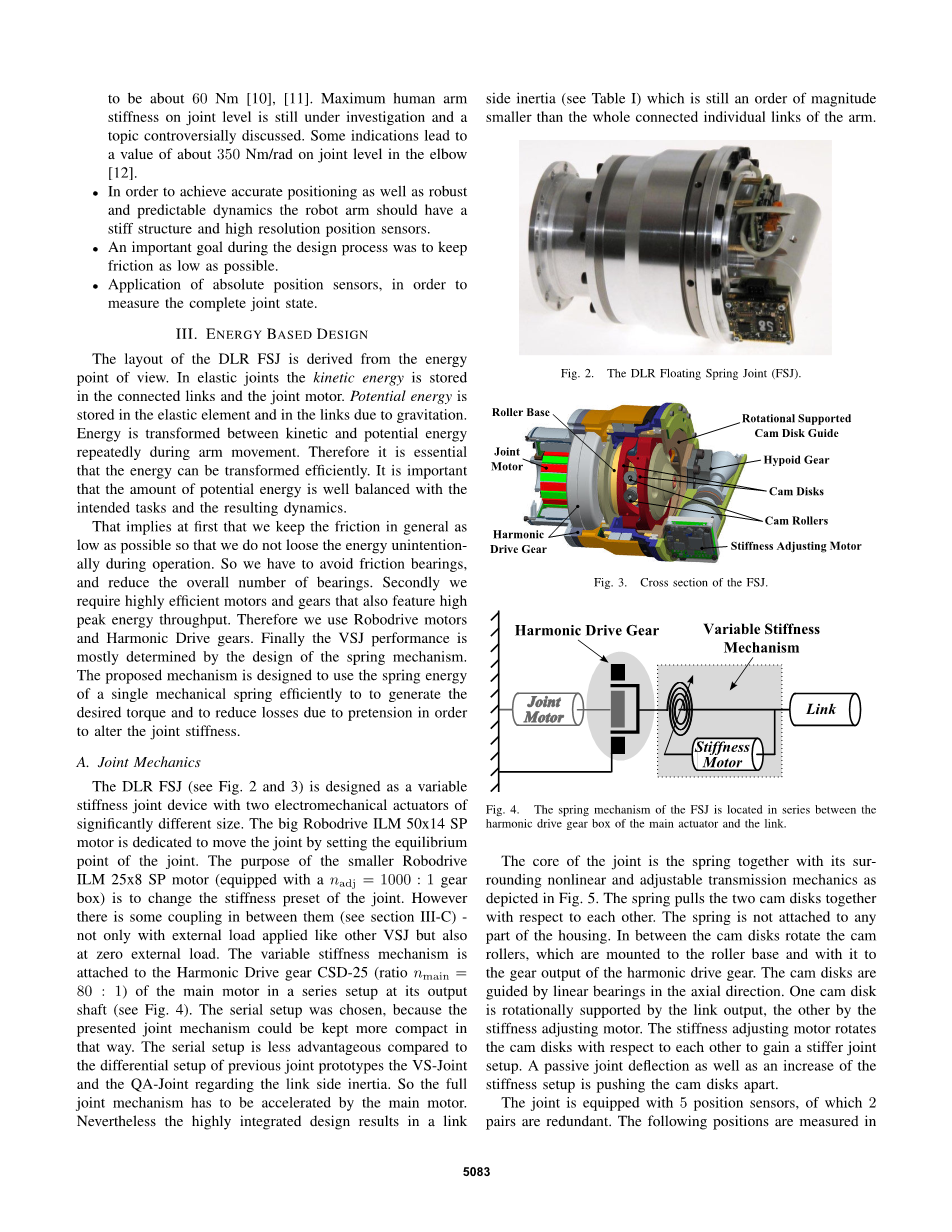 DLR浮动弹簧关节(FSJ)的布局是从能量的角度出发的。在弹性关节中,动能储存在连接的连杆和关节马达中。由于重力作用,势能储存在弹性元件和连杆中。在手臂运动期间,能量会在动能和势能之间反复转换。因此,能量必须得到有效转化。重要的是,势能的总量要与预期的任务和产生的动力很好地平衡。