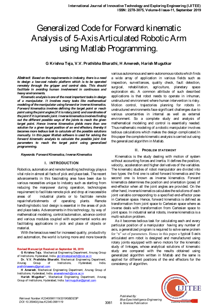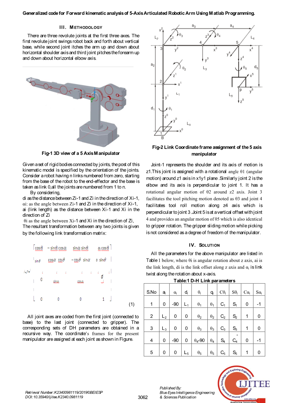 通过表I中所示的DH参数为每个链接计算的转换矩阵在(1)中给出,而整体转换如在(2)中计算: