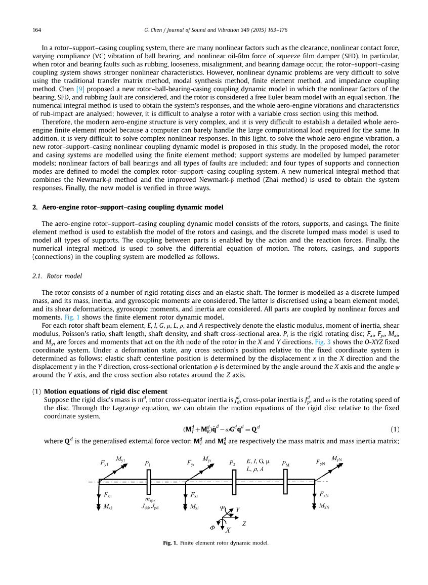 在一个转子-支承-机匣耦合系统中,有许多非线性因素,如间隙、非线性接触力、球轴承变刚度(VC)振动和挤压油膜阻尼器的非线性油膜力(SFD)。特别是,当滚子和轴承有故障时,如磨损、松动、不对中,就会造成轴承损坏。转子-支承-机匣耦合系统则表现出更明显的非线性特性。然而,使用传统的矩阵变换法、模态分析法、有限元法阻抗连接法很难解决非线性动力学问题。Chen[9]提出了一种综合考虑轴承非线性因素、SFD和松动误差的转子-支承-机匣耦合动力学模型,转子被认为是一种等量的理想的欧拉梁模型。此模型使用数值积分法获得了系统响应,并分析了间隙影响下的航空发动机的整体振动特性,但这种方法很难用于分析变截面的转子模型。