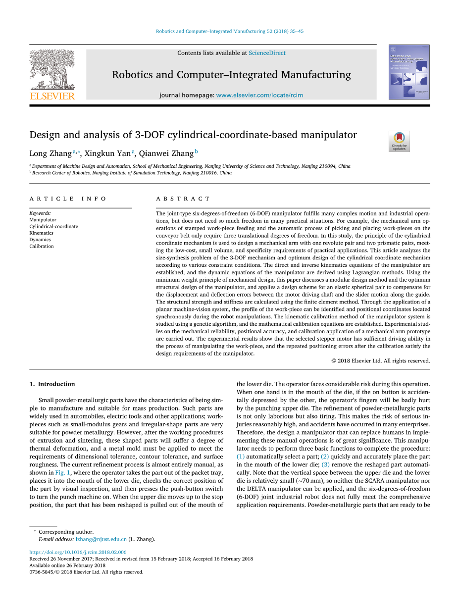 关节式六自由度机械手可以完成许多复杂的运动和工业操作,但在许多实际情况下不需要那么大的自由度。例如,机械臂操作的冲压工件进料和自动拣放工件的过程中只需要三个平动自由度,本文利用圆柱坐标机构的原理,设计了一种具有一对转动副和两对移动副的机械臂,满足了实际应用的低成本、小体积、特异性要求。本文分析了三自由度机构的综合尺寸问题,并根据各种约束条件对圆柱坐标机构进行了优化设计,同时利用拉格朗日方法,建立了机械手的正、逆运动学方程,推导了机械手的动力学方程。应用了机械设计的最小重量原理,来讨论机械手的模块化设计方法和优化结构设计,并应用弹性球面副的设计方案来补偿电机传动轴与导轨滑块运动之间的位移和挠度误差。采用有限元法计算了结构的强度和刚度。通过一个平面机器视觉系统的应用,可以在机器人操作过程中同步识别工件的轮廓和定位坐标。利用遗传算法研究了机械手系统的运动学标定方法,建立了数学标定方程。同时也在进行机械臂样机的机械可靠性、定位精度和标定应用的实验研究,实验结果表明,所选步进电机在加工工件过程中具有足够的驱动能力,标定后的重复定位误差满足机械手的设计要求。