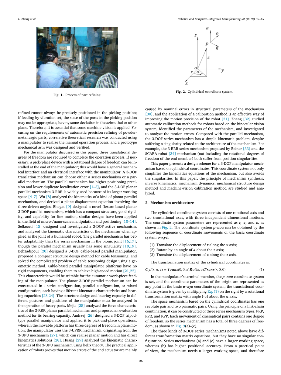 圆柱坐标系由一个旋转轴和两个平动轴组成,具有独立的三维运动。坐标系参数表示为r, alpha;, z,如图2所示。坐标系p -noa可由基本坐标系o -xyz的坐标运动序列得到:
