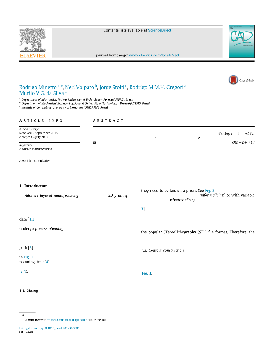 本文的贡献三个方面:(1)最优算法对任意层厚度的三角形网格分割问题,运行在O(n日志k k m)其中n是三角形的数量,k是飞机的数量,m是段的总数(平面三角形路口)模型。如果层厚均匀,或者三角形之前是按z坐标排序的,则算法运行时间为O(n k m);(2) 证明未分类非均匀切片问题的下界是Ω(nlogk k m); (3)轮廓构造的最优(线性时间)算法。