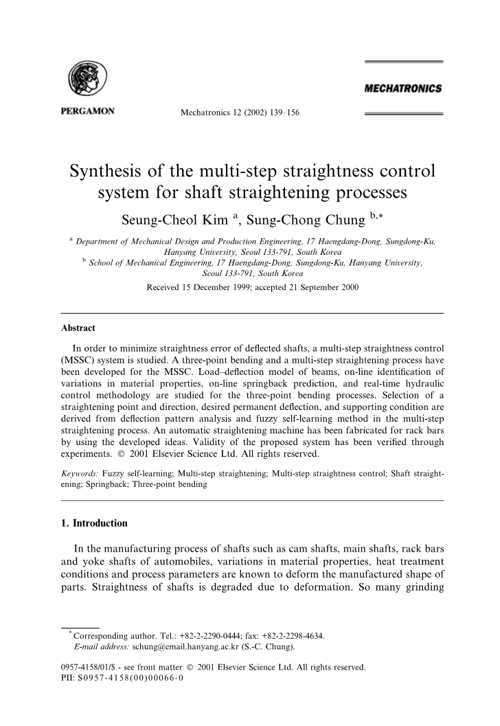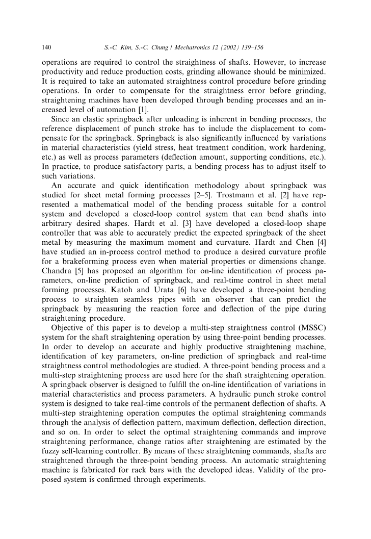 为了减小偏轴直线度误差,研究了一种多步直线度控制系统。提出了一种三点式弯曲矫直工艺,并对其进行了多步矫直。研究了三点弯曲过程中梁的荷载-挠度模型、材料性能变化的在线识别、在线回弹预测和实时液压控制方法。通过多步矫直过程中的挠度模式分析和模糊自学习方法,确定了矫直点和矫直方向、所需的永久挠度和支护条件。利用该思想研制了一种齿条自动矫直机。通过实验验证了该系统的有效性。