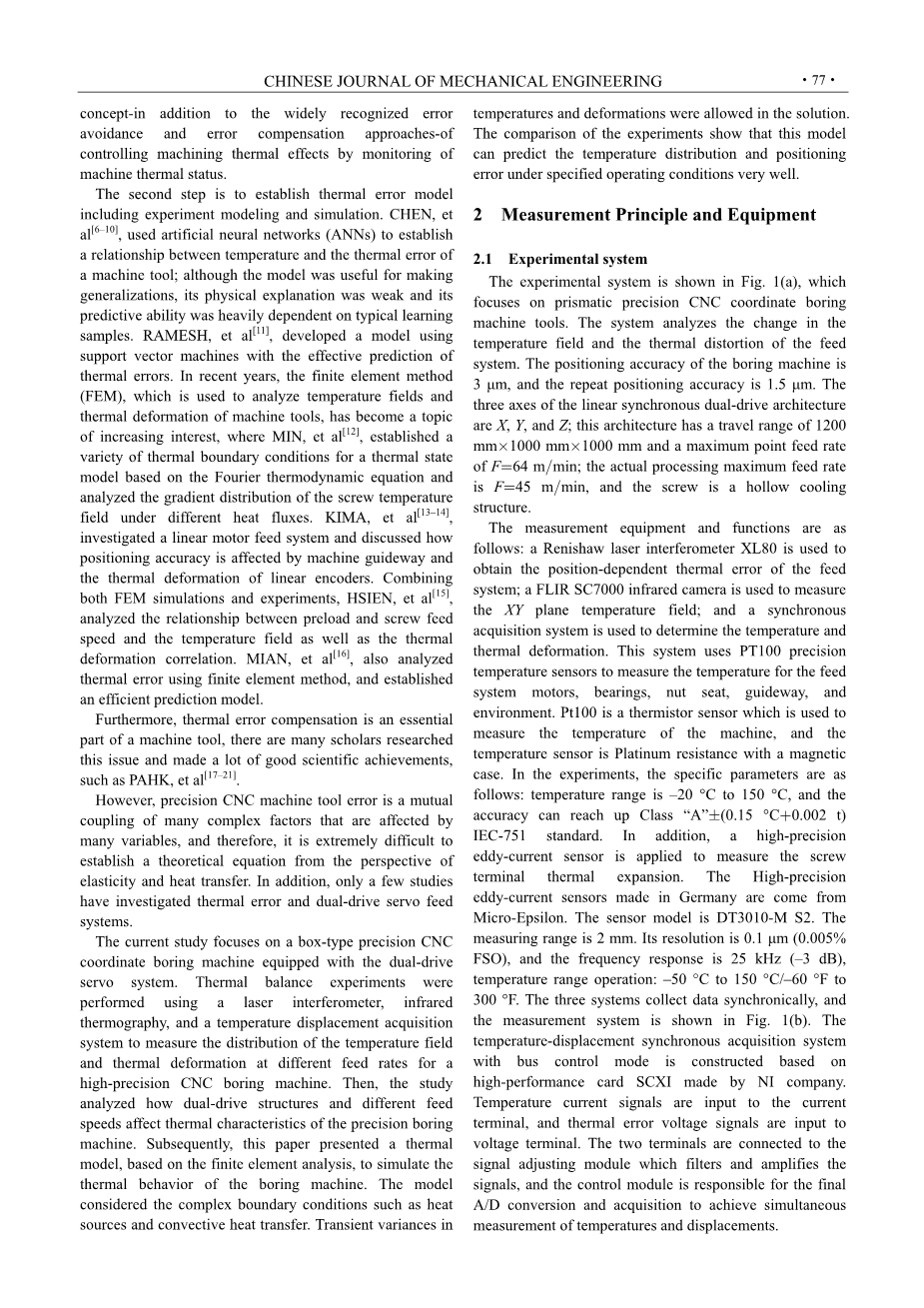 测量设备及功能如下:采用Renishaw激光干涉仪XL80获取进料系统的相关位置热误差;采用FLIR SC7000红外摄像机对XY平面温度场进行测量;同时采用同步采集系统测定温度和热变形。该系统采用PT100精密温度传感器对进料系统的电机、轴承、螺母座、导轨和环境温度进行测量。Pt100是一种热敏电阻传感器,用于测量机器温度,温度传感器为铂电阻,带有磁性外壳。在实验中,具体参数如下:温度范围为-20℃-150℃,精度可以达到A等IEC-751标准。此外,采用高精度涡流传感器对螺杆端面热膨胀进行测量,这种高精度涡流传感器采用德国米铱技术,传感器模型为DT3010-M S2,测量范围为2mm,分辨率为0.1mu;m,频率响应为25kHz(-3 dB),可操作温度范围为-50℃-150℃。三个系统同步采集数据,测量系统如图1(b)所示。以NI公司高性能的SCXI卡为基础,构建了总线控制模式的温度-位移同步采集系统,温度电流信号从电流端输入,热误差电压信号从电压端输入,两个终端都连接到信号调节模块,信号调节模块可以进行信号滤波和放大,由控制模块负责最后的A/D转换和采集,完成温度和位移的同步测量。