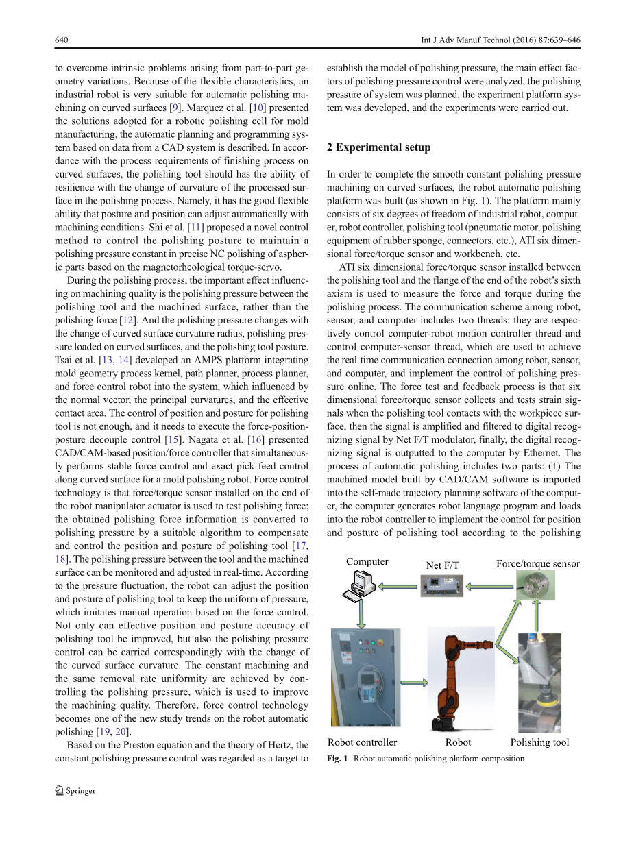 安装在抛光工具和机器人第六轴的末端的凸缘之间的ATI六维力/扭矩传感器用于测量抛光过程中的力。机器人,传感器和计算机之间的通信方案包括两个线程:它们分别是控制计算机 - 机器人运动控制器线程和控制计算机 - 传感器线程,用于实现机器人,传感器和计算机之间的实时通信连接,并在线进行抛光压力控制。力测量和反馈过程是力传感器在抛光工具与工件表面接触时收集并测试应变信号,然后通过Net F / T调制器将信号放大并滤波为数字识别信号,最后,数字识别信号通过以太网输入到计算机。自动抛光过程包括两部分:(1)将CAD / CAM软件构建的加工模型导入到计算机自动轨迹规划软件中,计算机生成机器人语言程序并加载到机器人控制器中,根据抛光算法控制抛光工具的位置和姿势,最后机器人根据路径轨迹开始加工。(2)在抛光过程中,通过力传感器和Net F / T调制器实时测量,采集和转换抛光力信号,将数据实时传输到计算机并进行处理。通过控制算法将抛光力转换为抛光压力。并且将预设抛光压力和测量抛光压力之间的差值转换为抛光工具的位置和姿势的校正值。校正值被传送到机器人控制器,用于驱动机器人调整抛光工具以保持抛光压力恒定。抛光压力的实时补偿是为了确保整个过程中闭环恒定的抛光压力控制。曲面上的机器人抛光可以从图2中看出。