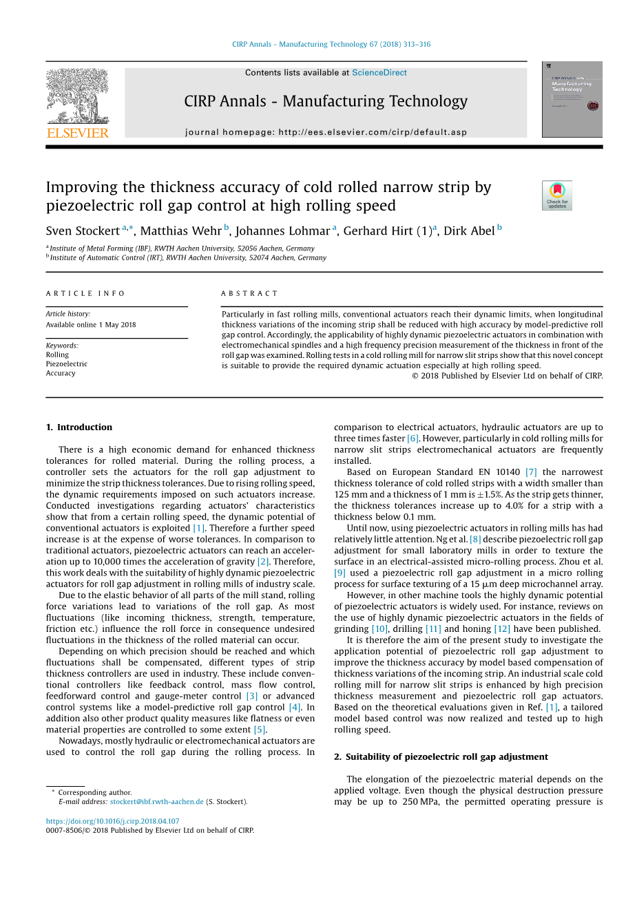 对于轧制材料的增强的厚度公差存在高经济需求。在轧制过程中,控制器设置用于辊缝调整的致动器,以最小化条带厚度公差。由于轧制速度上升,对这种致动器施加的动态要求增加。对致动器特性进行的研究表明,从一定的滚动速度,可以利用传统执行器的动态潜力[1].因此,进一步的速度增加是以更差的公差为代价的。与传统的致动器相比,压电致动器的加速度可达到重力加速度的10,000倍[2].因此,这项工作涉及高动态压电致动器在工业规模轧机中的辊缝调整的适用性。由于轧机机架的所有部件的弹性行为,轧制力变化导致轧辊间隙的变化。由于大多数波动(例如进入的厚度,强度,温度,摩擦等)影响辊力,因此是不希望的可能发生轧制材料厚度的波动。根据应达到的精度和应补偿的波动,在工业中使用不同类型的带材厚度控制器。这些包括传统控制器,如反馈控制,质量流量控制,前馈控制和仪表控制[3] 或先进的控制系统,如模型预测辊缝控制[4].此外,还可以在一定程度上控制其他产品质量测量,例如平整度或甚至材料特性[5].如今,大多数液压或机电致动器用于在轧制过程中控制轧辊间隙。在与电动执行器相比,液压执行器的速度提高了三倍[6].然而,特别是在用于窄缝带的冷轧机中,经常安装机电致动器。基于欧洲标准EN 10140[7] 宽度小于125毫米,厚度为1毫米的冷轧带材的最窄厚度公差为1.5%。随着条带变薄,对于厚度小于0.1mm的条带,厚度公差增加至4.0%plusmn;。到目前为止,在轧机中使用压电致动器的关注度相对较低。Ng等人。[8] 描述了用于小型实验室研磨机的压电辊隙调整,以便在电辅助微轧制过程中对表面进行纹理化。周等人。[9] 在微轧制过程中使用压电辊缝调整,用于15mm深的微通道阵列的表面纹理化。然而,在其他机床中,压电致动器的高动态潜力被广泛使用。例如,关于在磨削领域中使用高动态压电致动器的评论[10],钻井[11] 和珩磨[12] 已经出版。因此,本研究的目的是研究压电辊缝调整的应用潜力,通过基于模型的进入带厚度变化补偿来提高厚度精度。通过高精度厚度测量和压电辊隙致动器,增强了用于窄缝带的工业规模冷轧机。基于参考文献中给出的理论评估。[1],现在实现了定制的基于模型的控制,并进行了高达测试滚动速度。