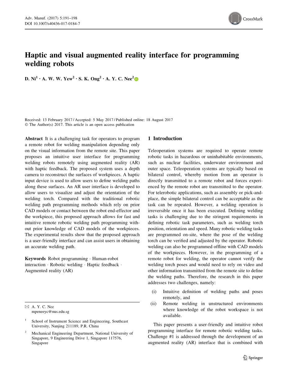 本文提供了一个用于远程机器人焊接任务的用户友好且直观的机器人编程界面。难点一是通过开发与触觉反馈相结合的非线性现实(AR)接口来解决。触觉反馈允许用户感知远处工件的表面,用以引导用户沿着工件表面定义焊接路径。 AR用户界面将虚拟机器人与远程工作空间的摄像头视图中的真实机器人叠加,从而允许用户可视化操作和调整末端执行器姿态,同时验证用户定义的焊接路径的可行性。难点二是使用点云数据集来解决的,点云数据集通过深度传感器获取数据,以重建工件表面的隐式曲面。在使用真实机器人执行任务之前,焊接任务首先通过AR界面使用虚拟机器人进行计划和仿真。由系统产生的焊接路径预期在实际的机器人工作区由焊缝跟踪器进一步处理,以精确定位工件上的焊缝。通过使用光学传感器(如激光扫描仪)来实现接缝跟踪,以找出工件表面高度的差异,从而定义焊接边缘。但是,仍然必须沿焊缝的路径进行定义,以便传感器可以扫描和定位焊缝。因此,本文所提出的系统设计用于在距工件表面一定距离处定义路径,以允许跟踪器扫描焊缝并防止焊炬与工件碰撞。